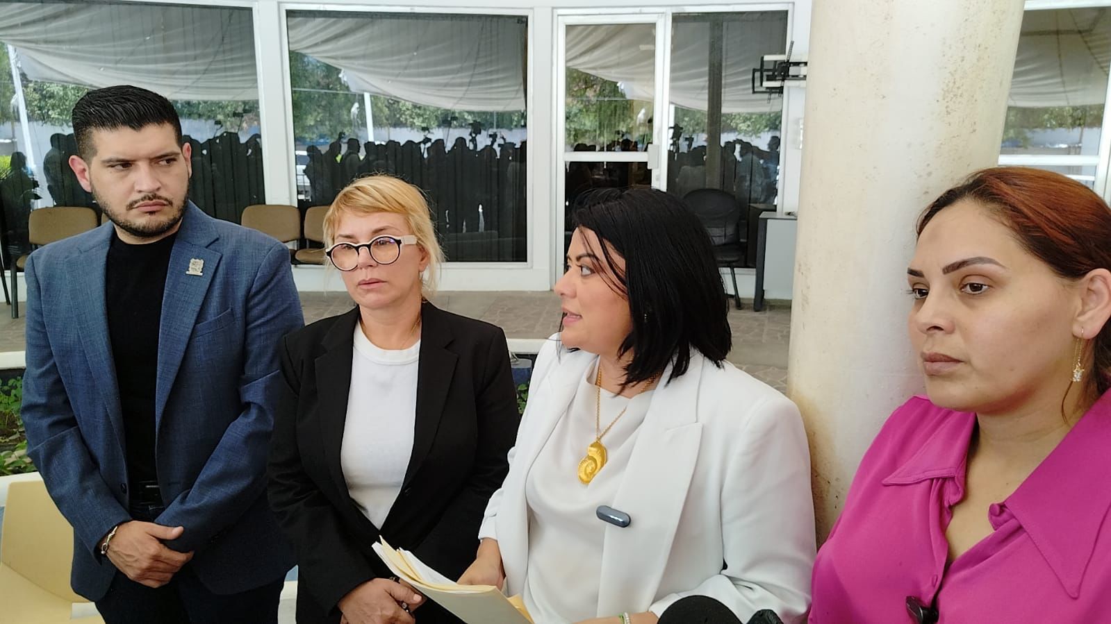 La denuncia presentada  por las diputadas Úrsula Patricia Salazar Mojica y Casandra Priscila de los Santos Flores, por hechos posiblemente constitutivos de delito, ocurridos en el recinto del Congreso del Estado el diez de julio. Les acompañan sus colegas Magaly Deándar y Alberto Granados.