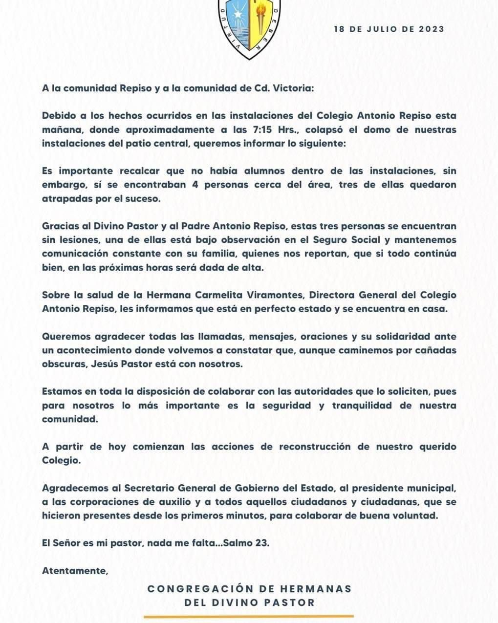 CD. VICTORIA, TAMAULIPAS, 18 DE JULIO DEE 2023.- Con el trabajo de coordinación entre Protección Civil Municipal, del Estado y fuerzas militares se logró con éxito el rescate y atención de personas lesionadas en el derrumbe de la techumbre del Colegio Antonio Repiso.