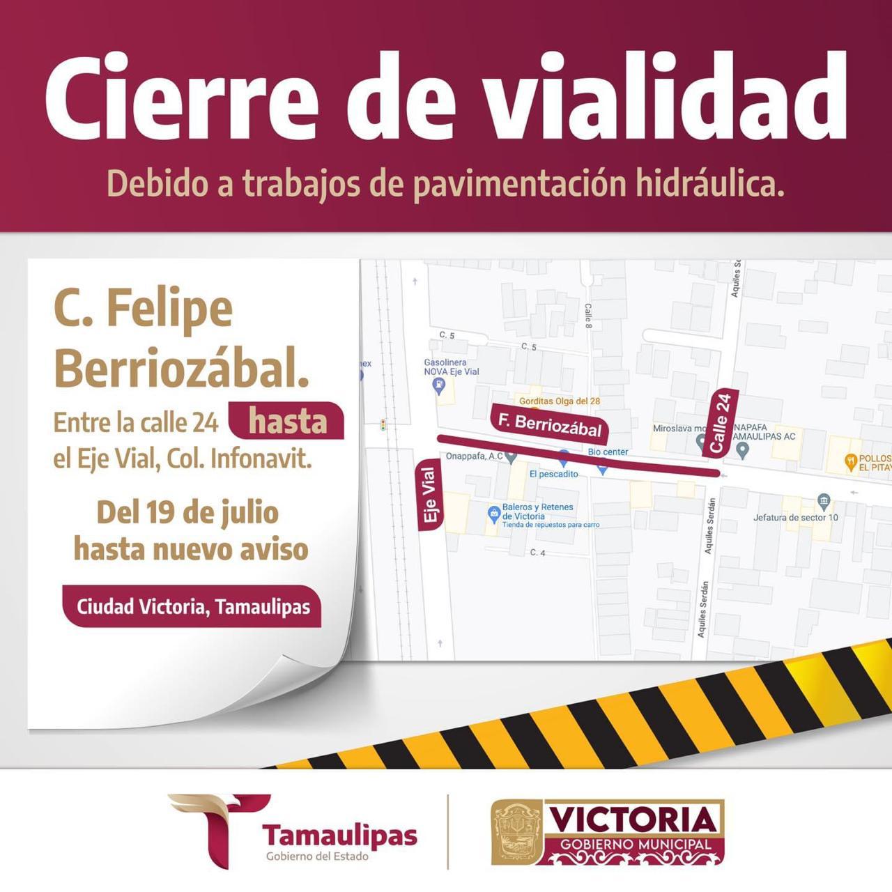 CD. VICTORIA, TAMAULIPAS, 19 DE JULIO DE 2023.- A partir de mañana, por trabajos de pavimentación, estará cerrada a la circulación vehicular la calle Felipe Berriozábal desde la calle 24 hasta llegar al Eje Vial Lázaro Cárdenas.