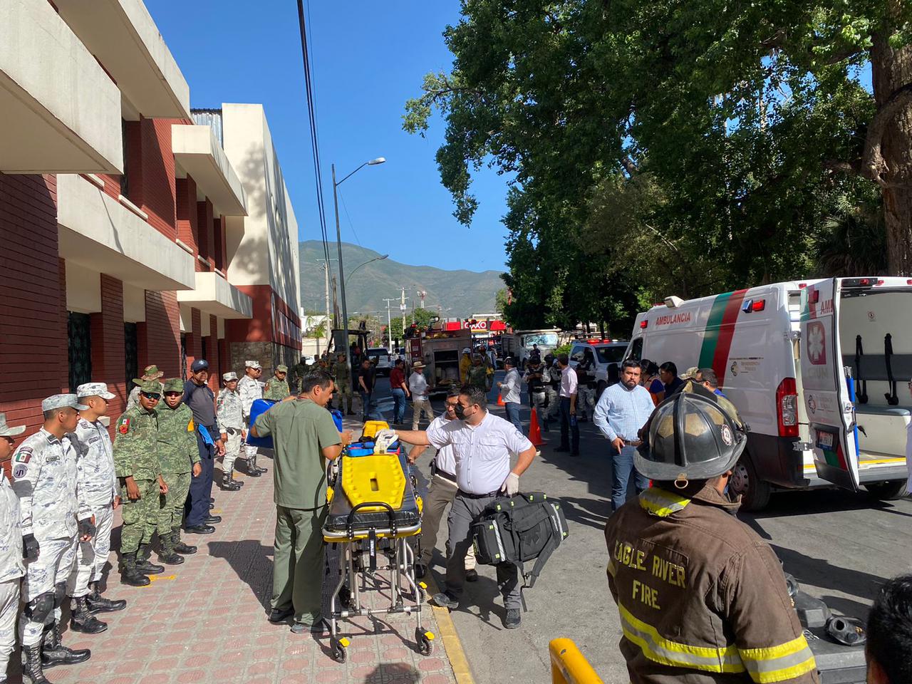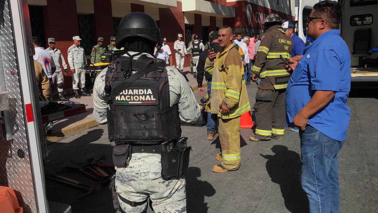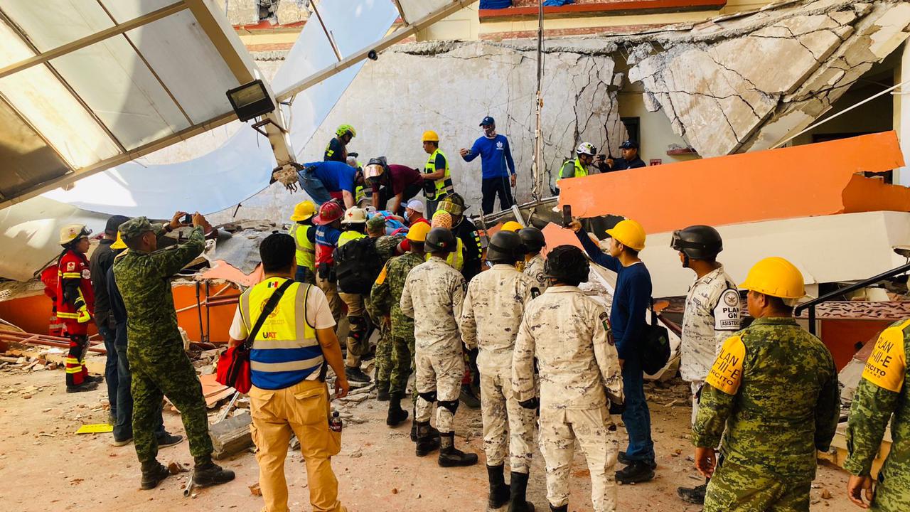 Corporaciones de Protección Civil Municipal y estatal, bomberos, SEDENA, Guardia Nacional y Estatal en operativo de rescate a personas atrapadas en derrumbe en el Colegio Antonio Repiso.