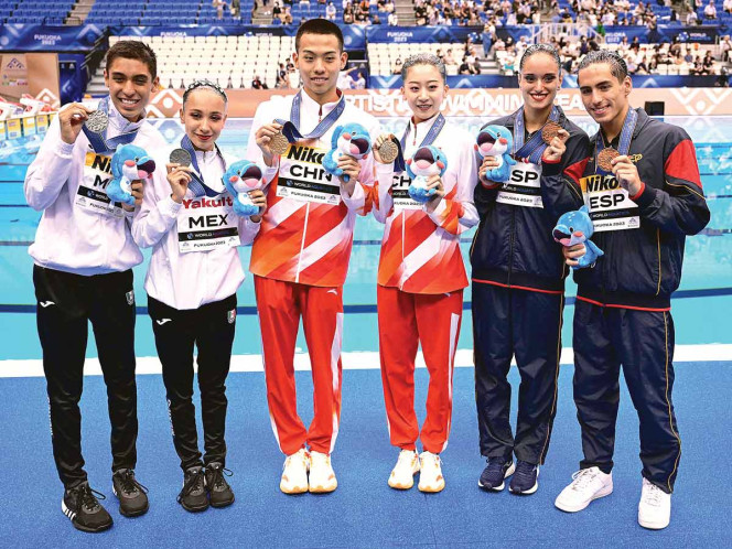 FUKUOKA,JAPON, 23 DE JULIO DE 2023.-Itzamary González y Diego Villalobos lograron una histórica primera medalla para México en la natación artística al colgarse la plata en la prueba de dueto libre mixto en Fukuoka 2023. El oro fue para China y el bronce para España.