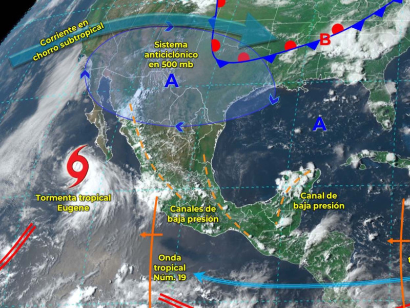 La tormenta tropical Eugene y el monzón mexicano mantendrá las condiciones para chubascos y lluvias puntuales fuertes acompañadas de descargas eléctricas, rachas de viento y posible caída de granizo en Baja California Sur, Sonora, Chihuahua, Durango y Sinaloa.