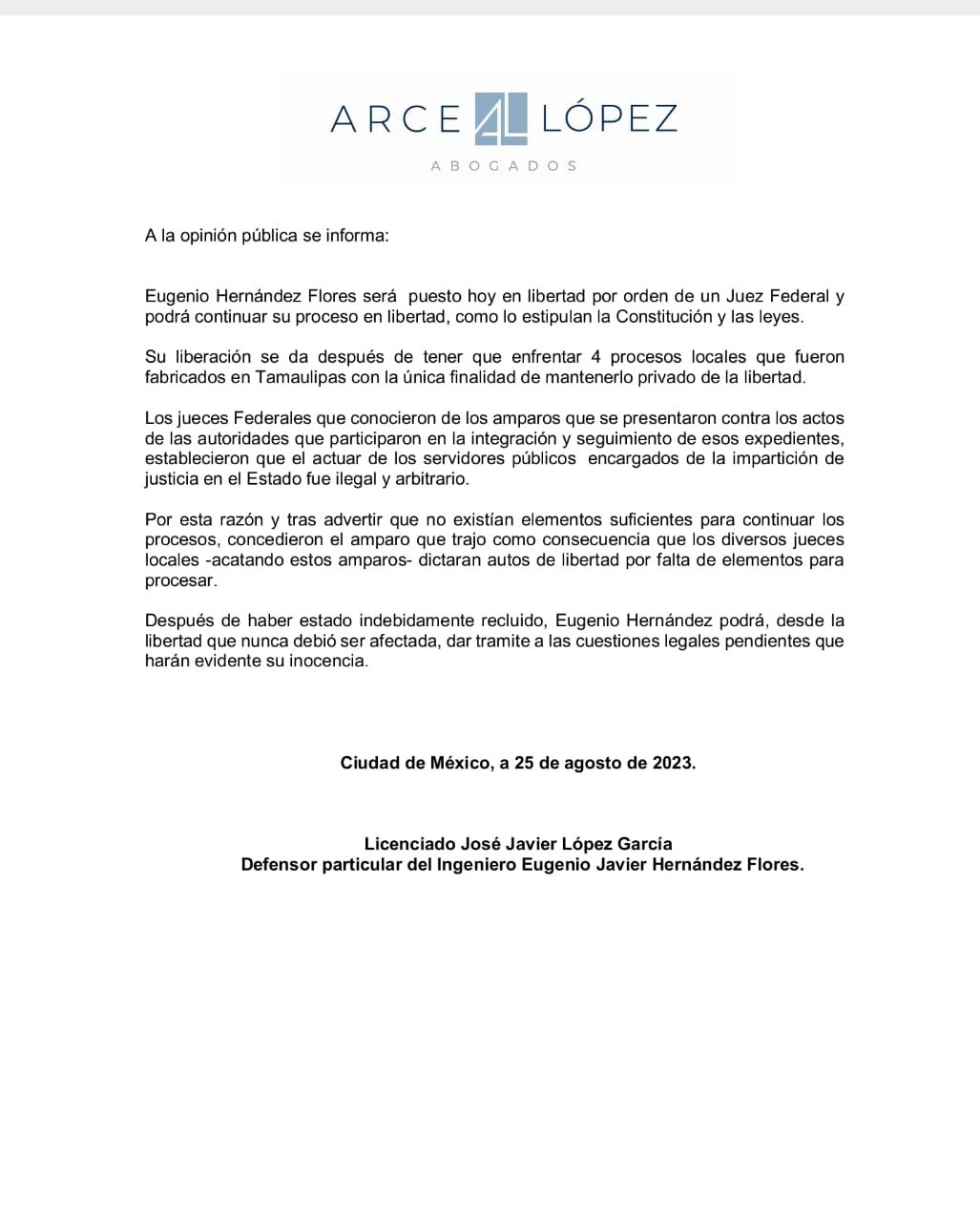 CD. DE MEXICO, 25 DE AGOSTO DE 2023.- A través de un comunicado de ésta mañana, el Despacho Jurídico Arce y López Abogados, informa que el ex gobernador de Tamaulipas Eugenio Hernández Flores recuperará este viernes su libertad, luego de casi 6 años de estar injustamente recluido por expedientes ilícitos y arbitrarios que le fabricaron en Tamaulipas