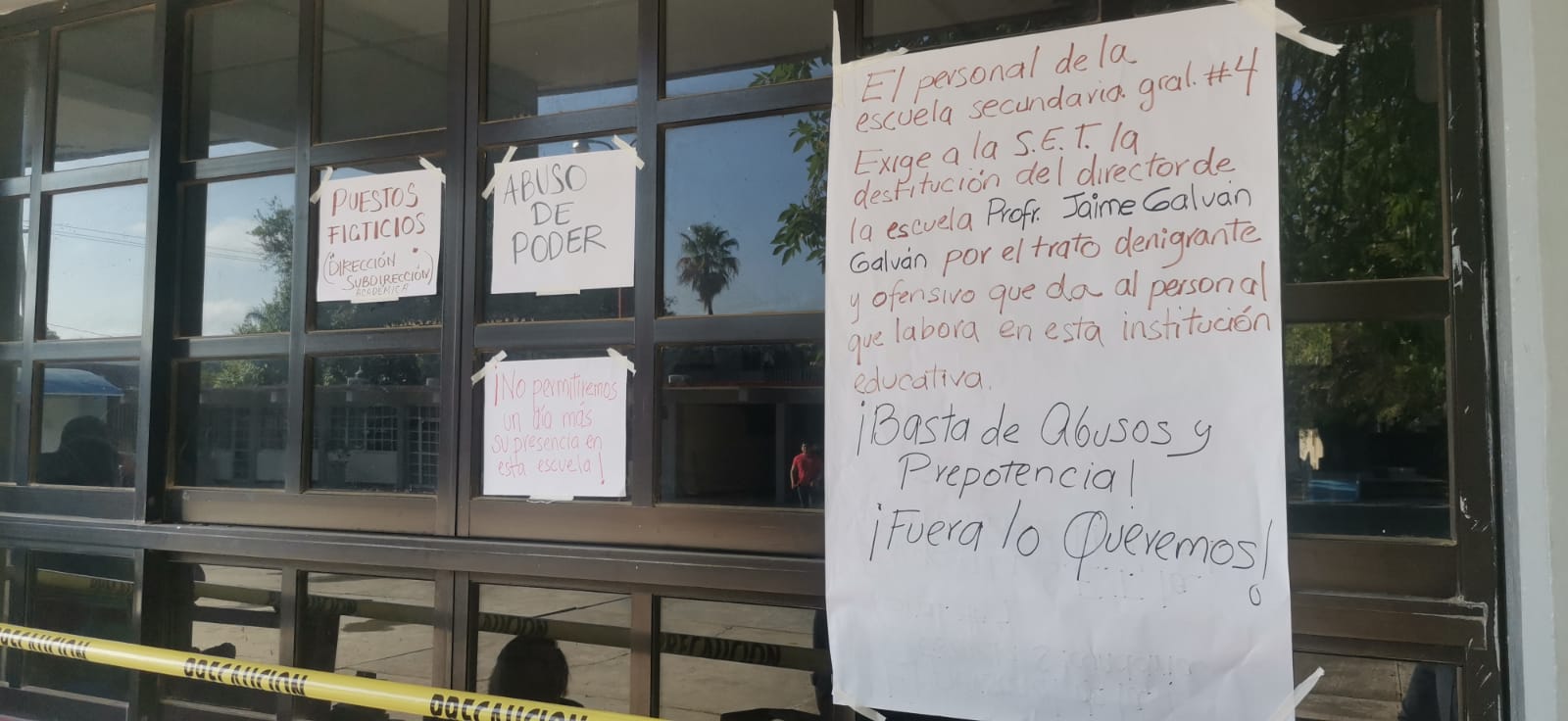 “El personal de la escuela secundaria general # 4 Exige a la S.E.T. La destitución del director de la escuela Profr. Jaime Galván Galván por el trato denigrante y ofensivo que da al personal que labora en esta institución educativa”.
