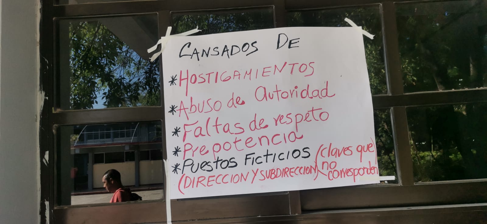 En una de las cartulinas pegadas afuera de la Dirección, el grupo de aproximadamente 50 maestros publicaron sus inconformidades.