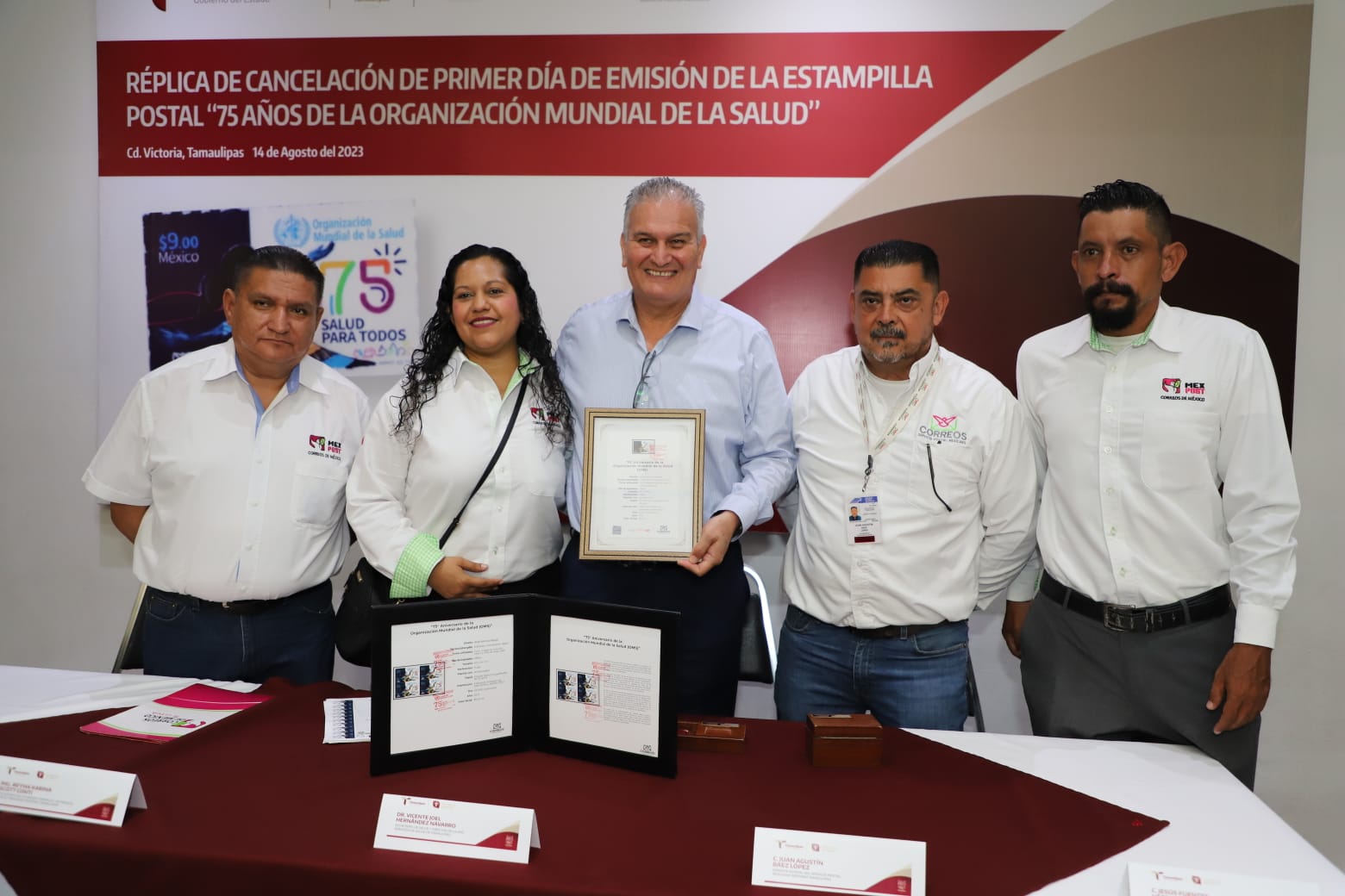 Acompañado por el gerente estatal del Servicio Postal Mexicano SEPOMEX en Tamaulipas, Juan Agustín Báez López, el secretario de Salud, Vicente Joel Hernández Navarro, presentó la réplica de cancelación del primer día de emisión de la estampilla postal, misma que se lleva a cabo en el marco de esta celebración y que este año tiene como lema “Salud para Todos”.