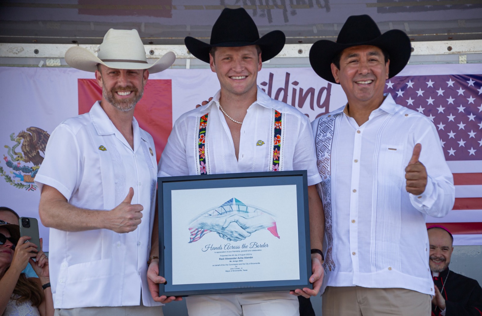 MATAMOROS, TAMAULIPAS, 4 DE AGOSTO DE 2023.-Los alcaldes de Matamoros, Mario Alberto López Hernández y de Brownsville, Texas, John Cowen, reafirmaron lazos de amistad entre las dos ciudades hermanas, teniendo como invitado a “Mr. Amigo 2023”, Alexander Acha, quien fue recibido con innumerables muestras de cariño.
