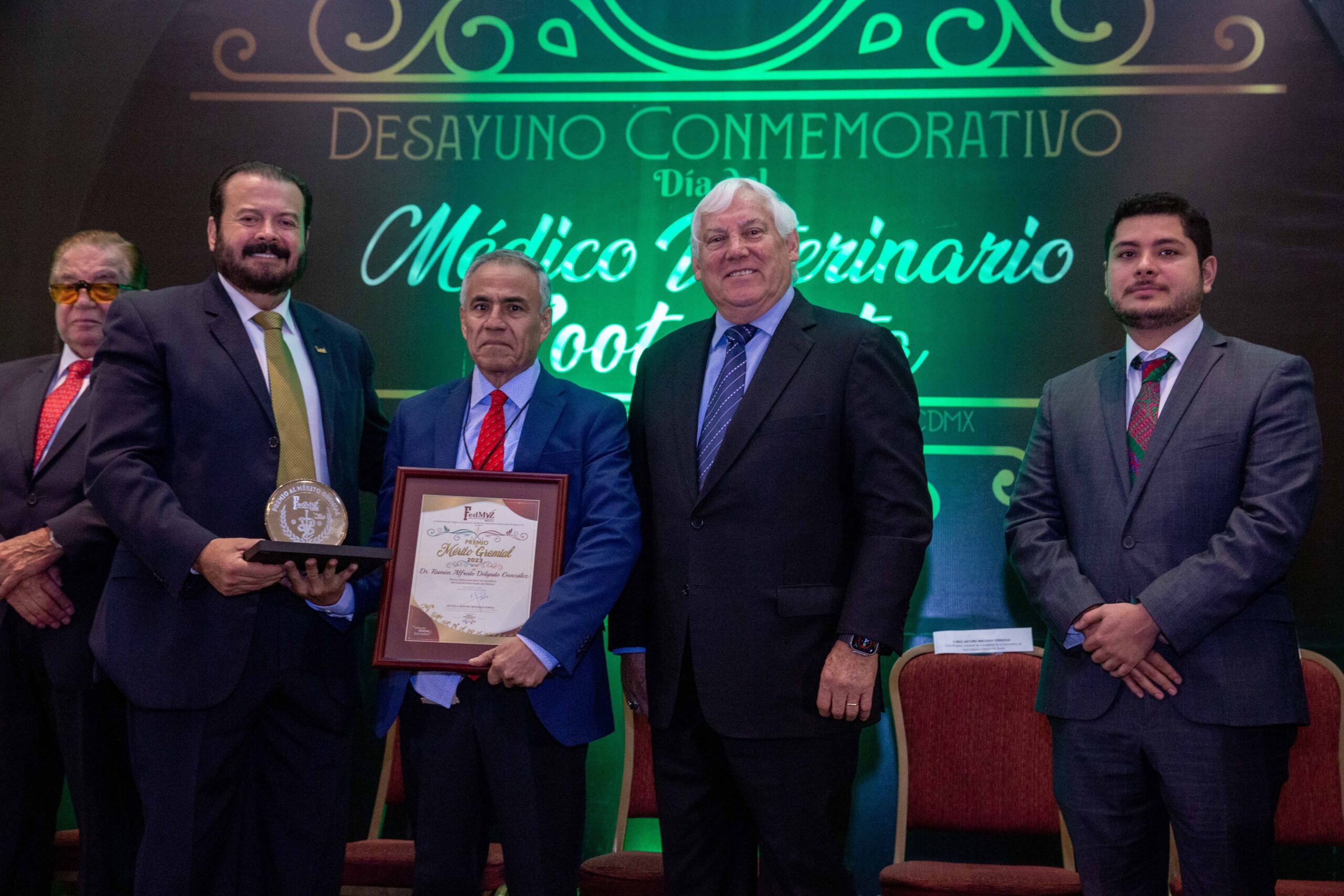 Durante el evento, el secretario Víctor Villalobos Arámbula entregó los reconocimientos de la FedMVZ a los médicos veterinarios zootecnistas, Assad Heneidi Zeckua y Ramón Alfredo Delgado González, por el Mérito Profesional y Gremial 2023, respectivamente.