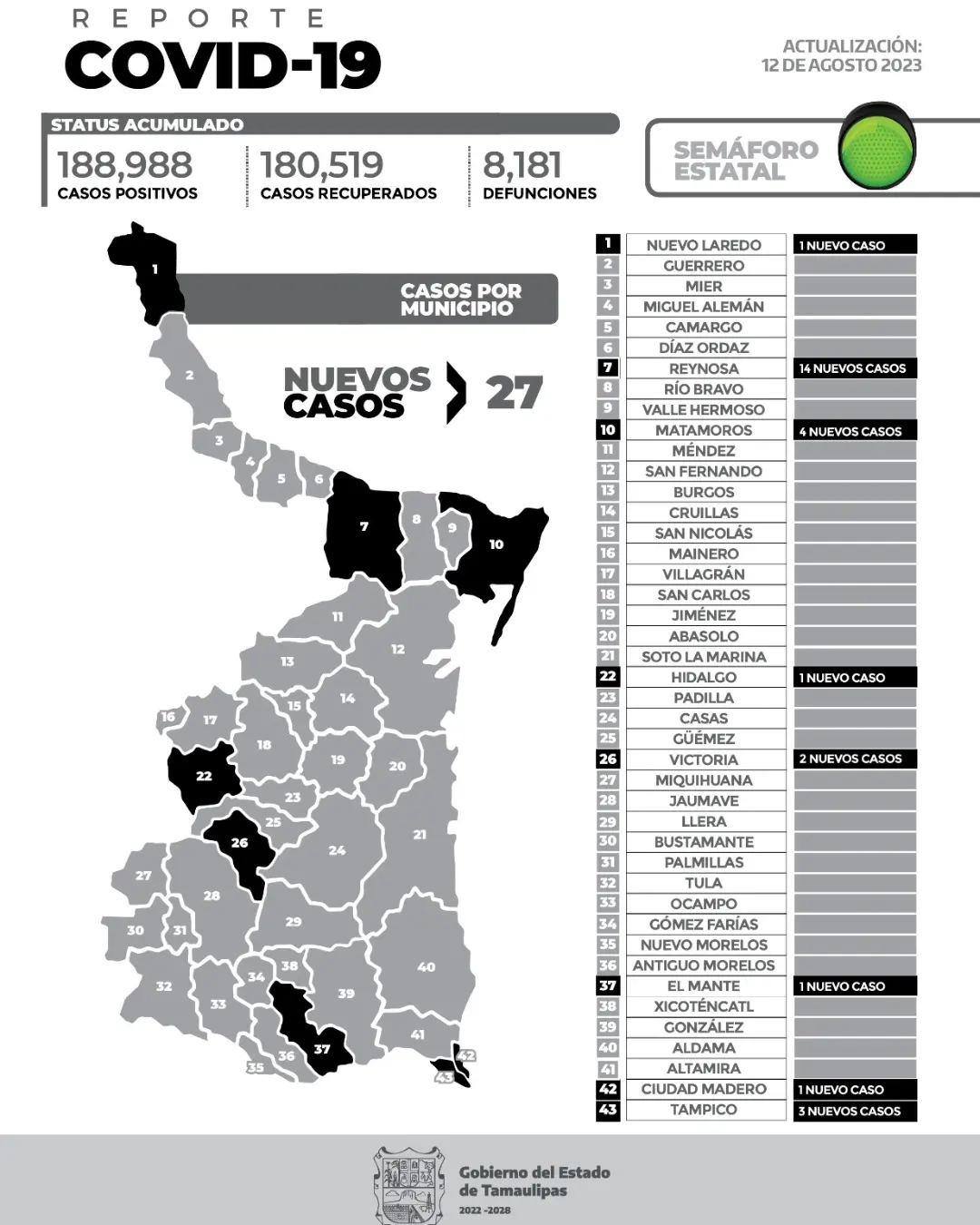 CD. VICTORIA, TAMAULIPAS, 12 DE AGOSTO DE 2023.– El reporte oficial de casos de COVID-19 de este sábado en la entidad registra 27 nuevos pacientes y sin fallecimientos.