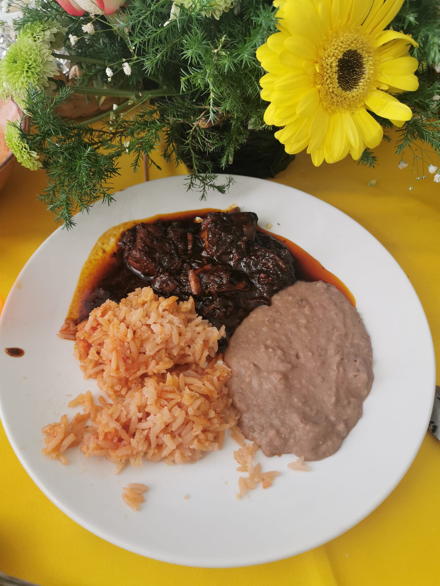 con arroz amarillo de cazuela, tortillas elaboradas a mano cocidas en comal de barro y