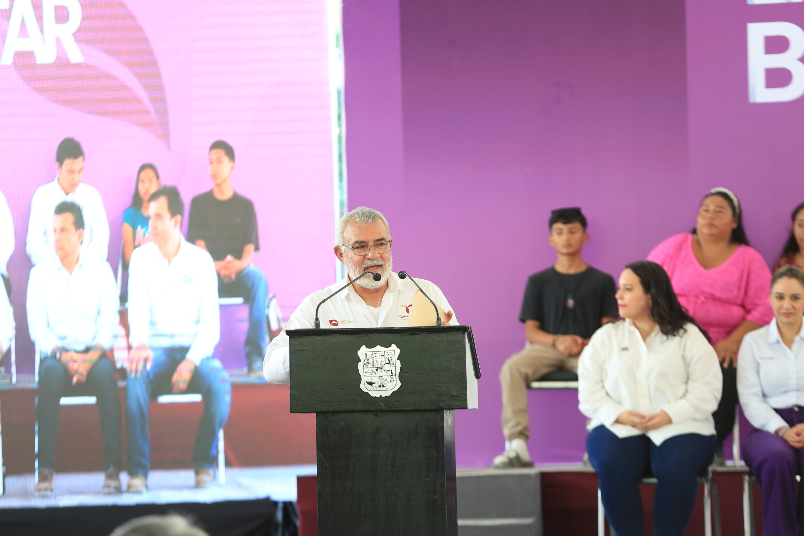 Durante la entrega de apoyos tomaron parte, la secretaria de Educación, Lucía Aimé