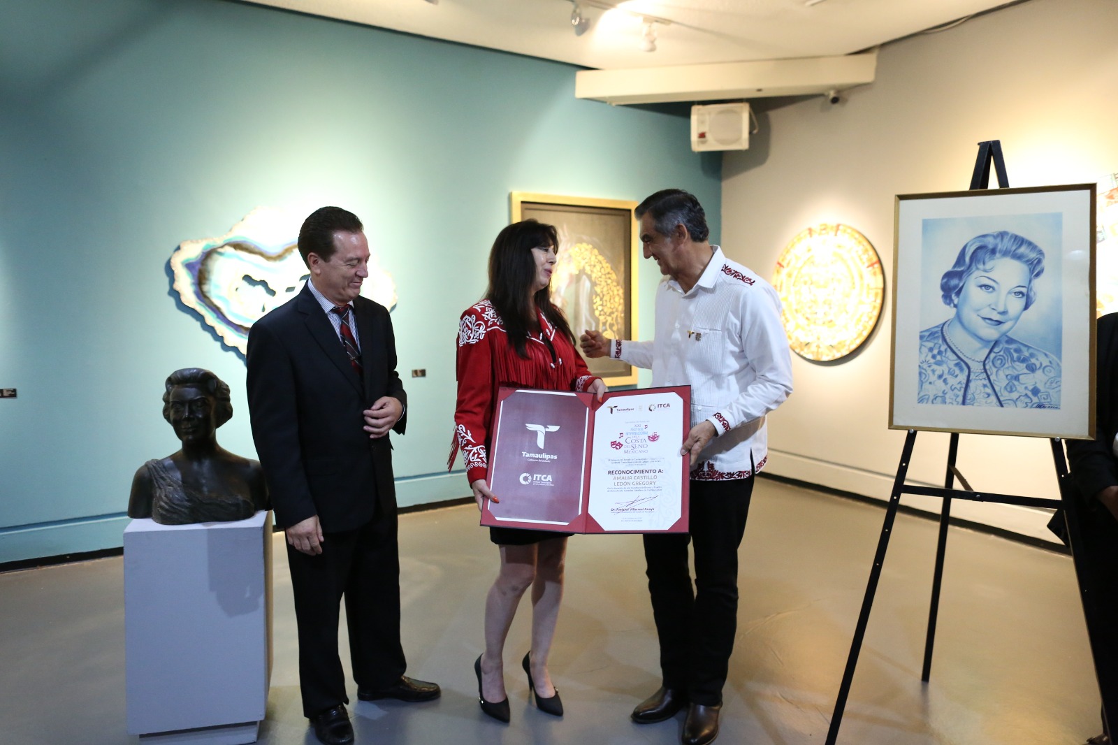 Ahí mismo recibió la donación de una escultura de Amalia González Caballero, por parte de Amalia Castillo Ledón, nieta de la destacada diplomática y activista tamaulipeca y de sus familiares.