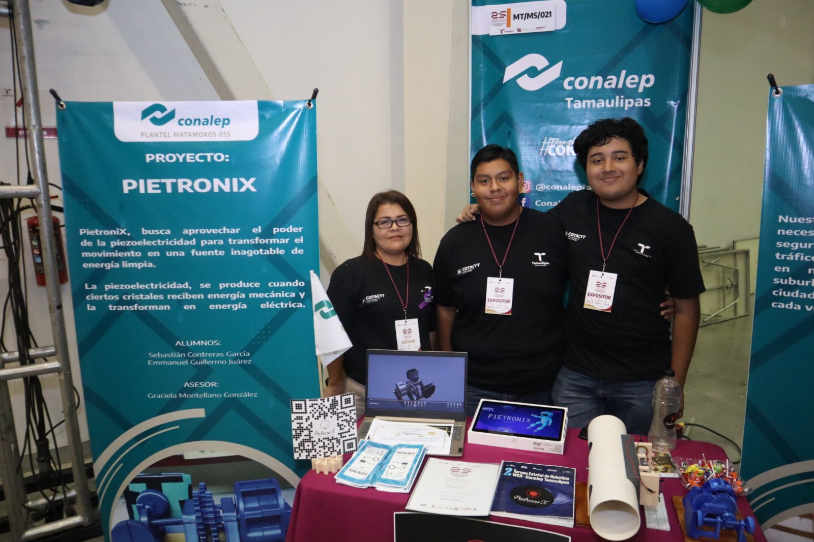 Ambos trabajos pertenecen al plantel CONALEP Matamoros y son asesorados por la maestra Graciela Montellano González. PietroniX, es desarrollado por los alumnos Sebastián Contreras García y Emmanuel Guillermo Juárez; se enfoca en aprovechar el poder de la piezoelectricidad para transformar el movimiento en una fuente inagotable de energía limpia.