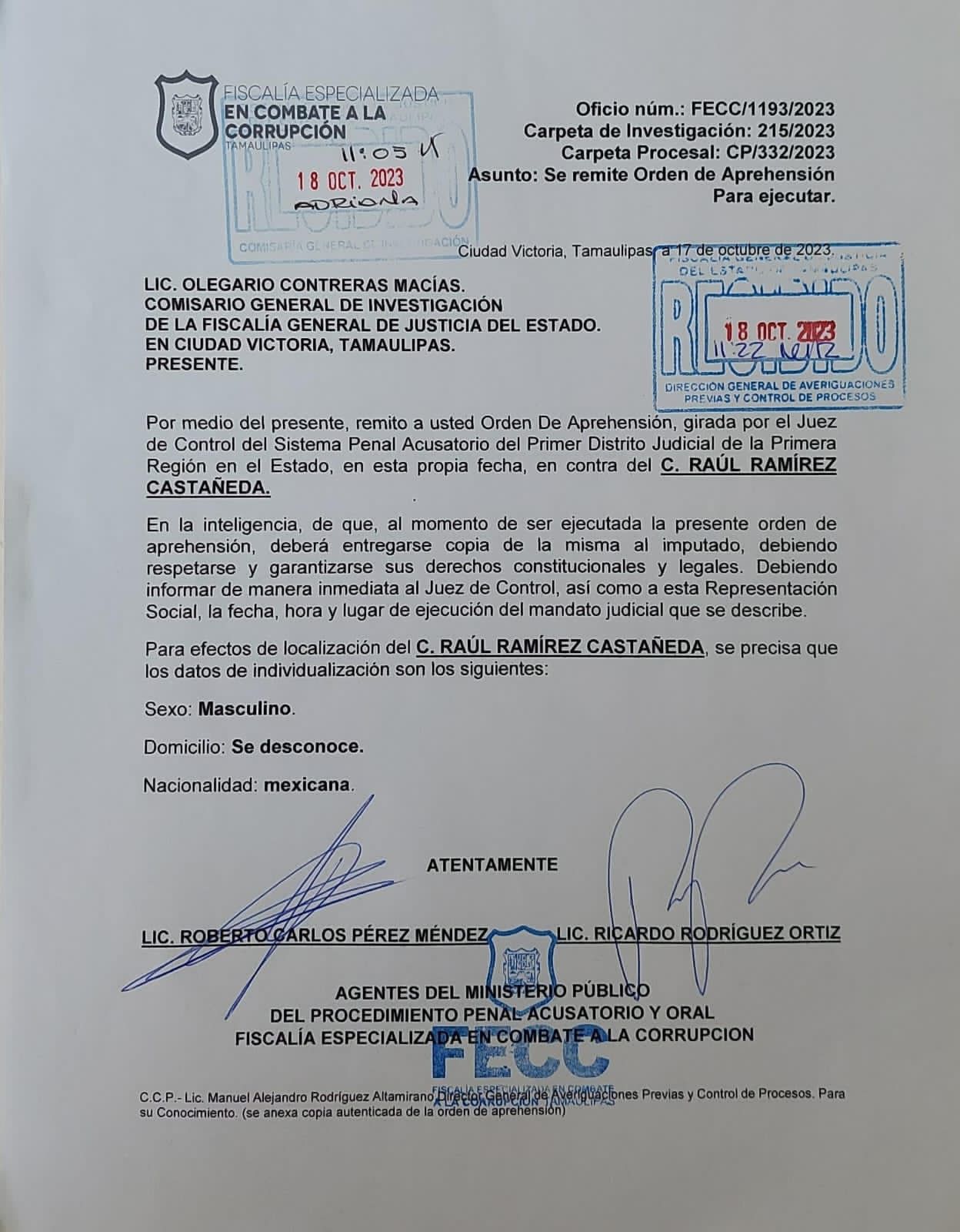 Con el oficio número FECC/1193/2023 los agentes del Ministerio Público del procedimiento penal Roberto Carlos Pérez Méndez y Ricardo Rodríguez Ortiz remitieron al comisario General de Investigación de la Fiscalía General de justicia del Estado Olegario Contreras Macías una orden de aprehensión girada por el Juez de Control del Sistema Penal Acusatorio del Primer Distrito Judicial de la Primera Región en el estado en contra de Raúl Ramírez Castañeda.