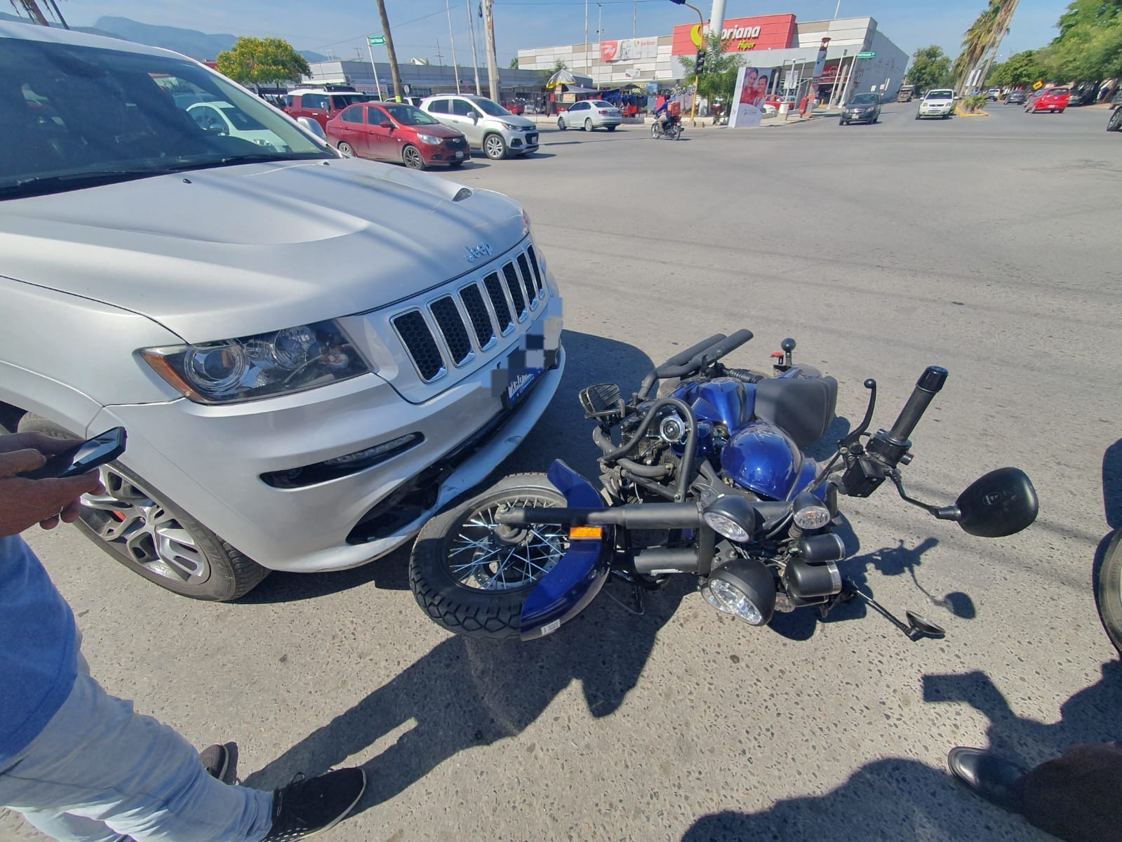 Al llegar al crucero con la calle Norberto Treviño Zapata el conductor de la camioneta intentó “volarse” la luz roja del semáforo para continuar avanzando por López Mateos y se impactó contra un motociclista que circulaba con preferencia de paso.