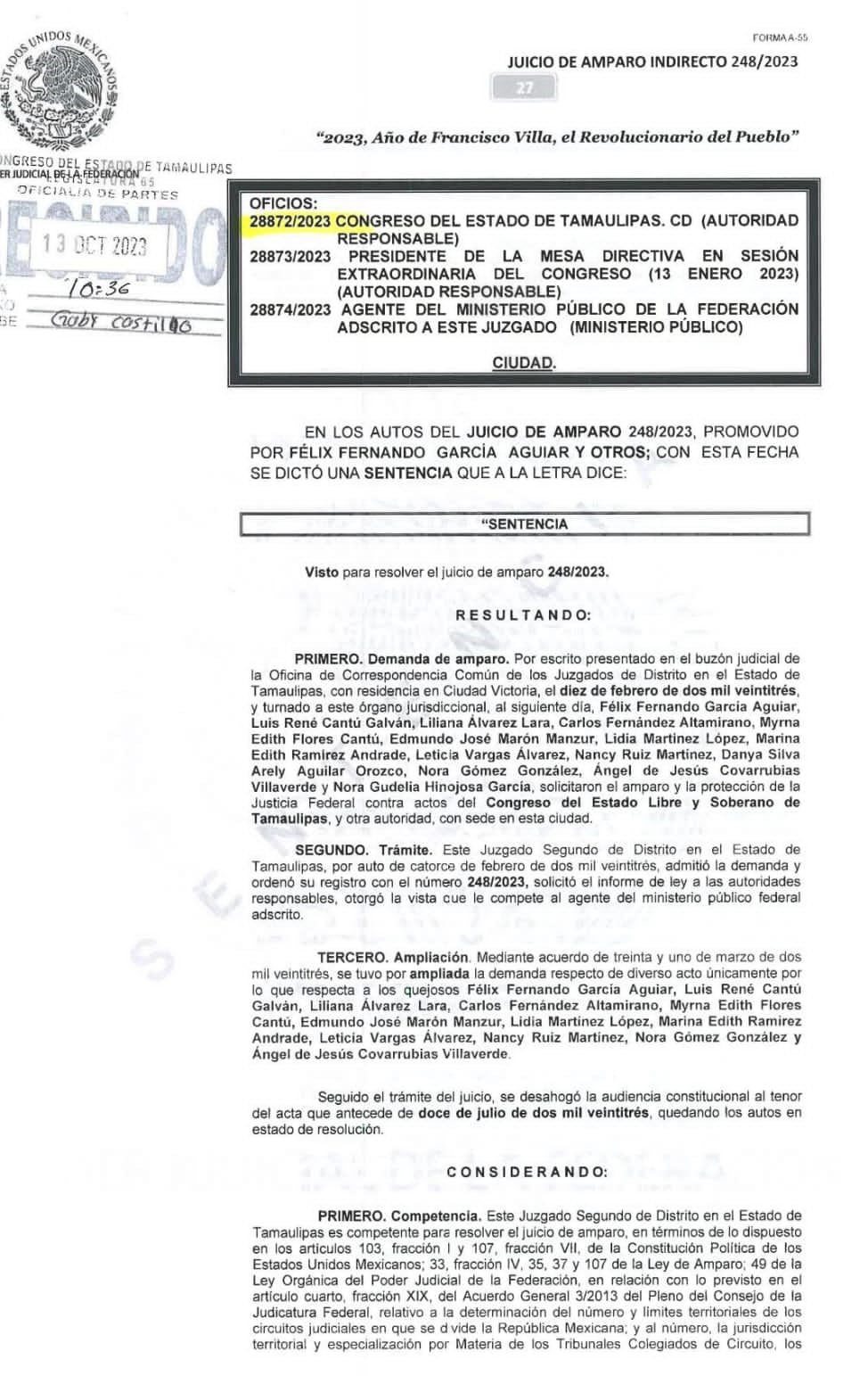 CD. VICTORIA, TAMAULIPAS, 13 DE OCTUBRE DE 2023.- El Juez Segundo de Distrito con sede en Victoria, determinó el sobreseimiento al amparo promovido por el diputado Félix García Aguiar, así como otros integrantes de su bancada, incluido el “priista”, Ángel Covarrubias, para seguir “peleando” la Junta de Coordinación Política del Congreso Local.