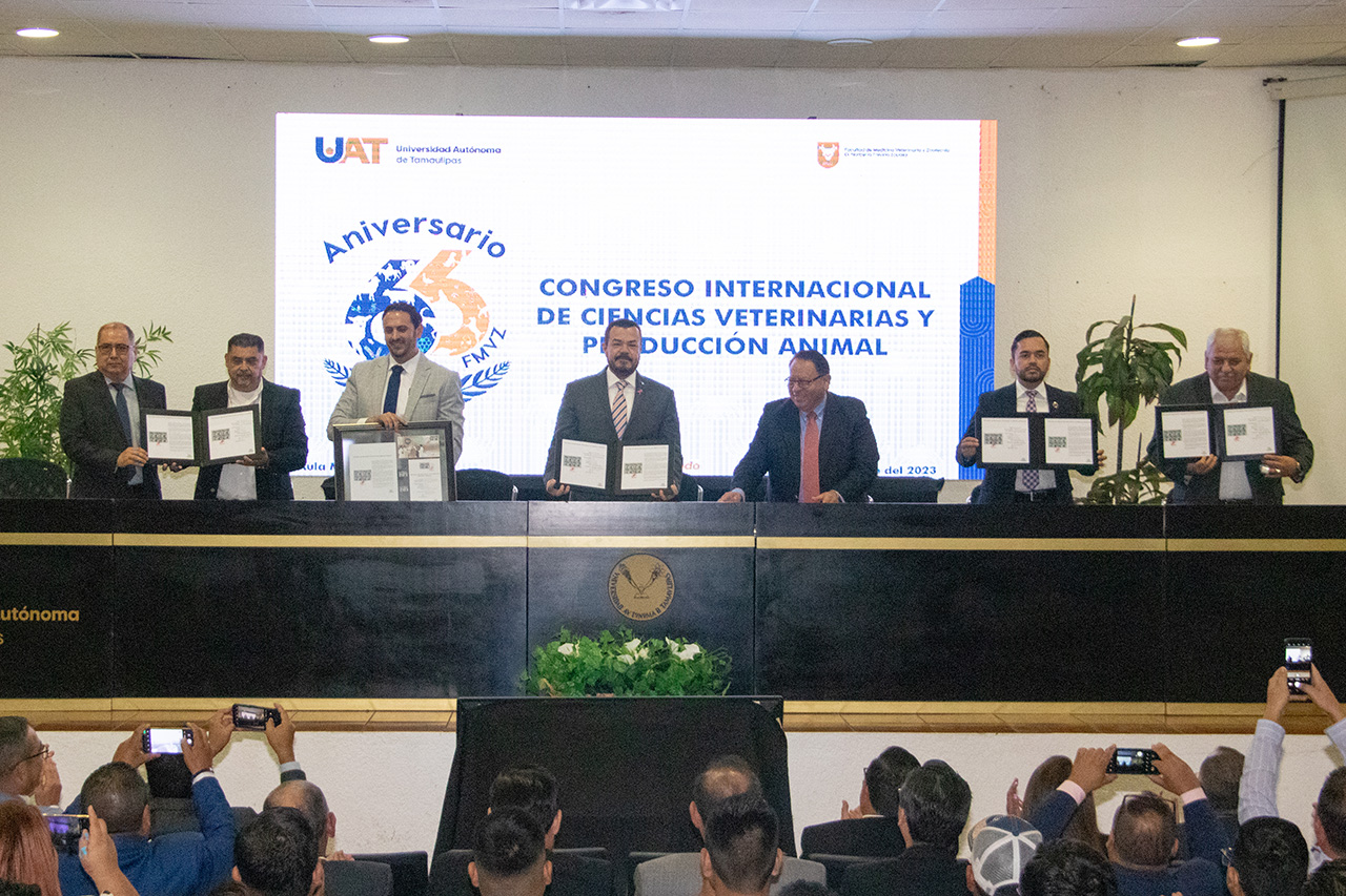 CD. VICTORIA, TAMAULIPAS, 16 DE OCTUBRE DE 2023.- El C.P. Guillermo Mendoza Cavazos, rector de la Universidad Autónoma de Tamaulipas (UAT), presidió la ceremonia conmemorativa del 66 Aniversario de la Facultad de Medicina Veterinaria y Zootecnia (FMVZ-UAT) “Dr. Norberto Treviño Zapata”, en cuyo marco inauguró el Primer Congreso Internacional de Ciencias Veterinarias y Producción Animal.