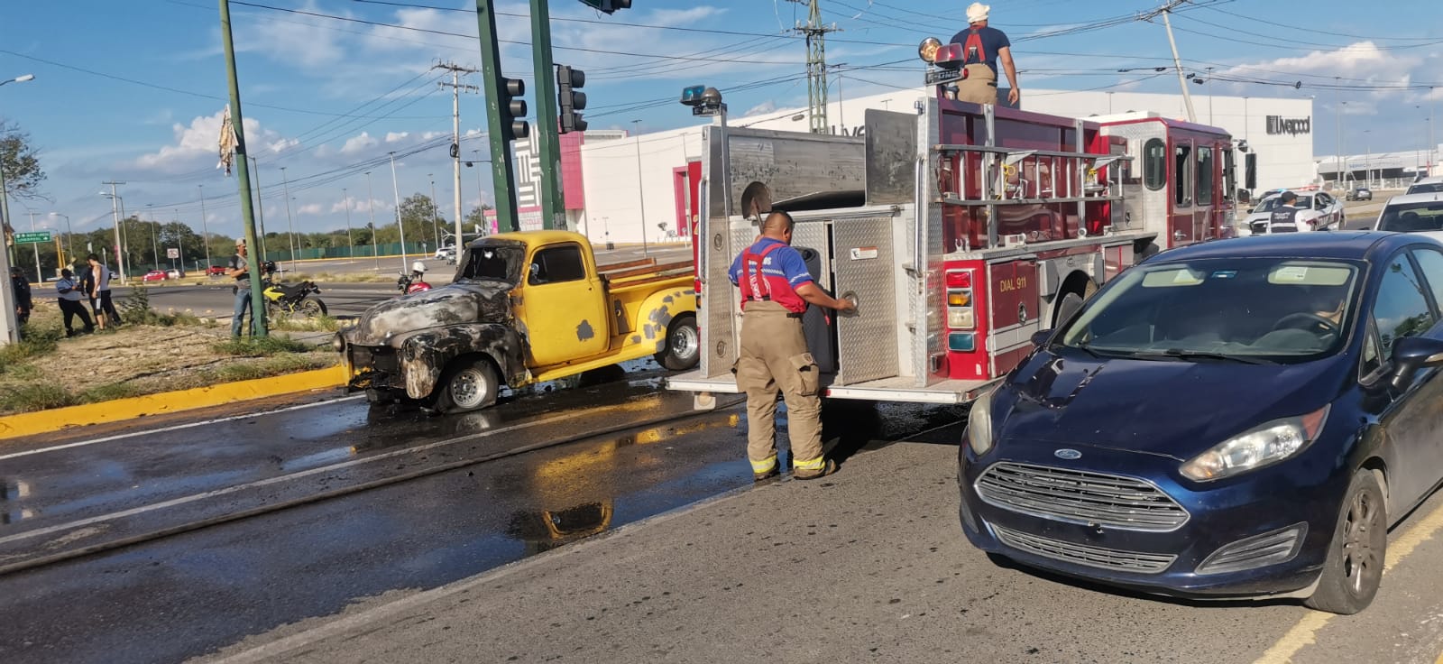 Al reportarse al número de emergencias 911 el incendio de una camioneta en el crucero del libramiento Naciones Unidas y Carretera a Monterrey, al lugar acudió una motobomba de la Coordinación Municipal de Protección Civil y Bomberos.