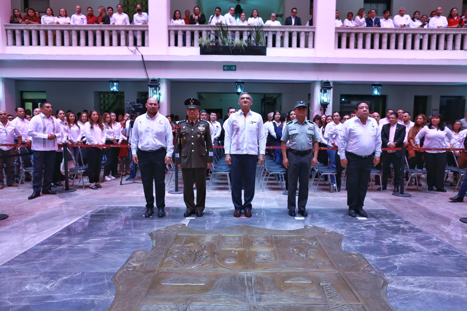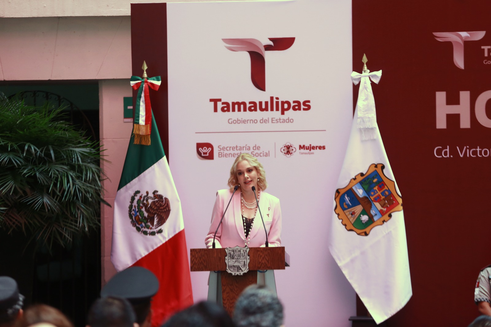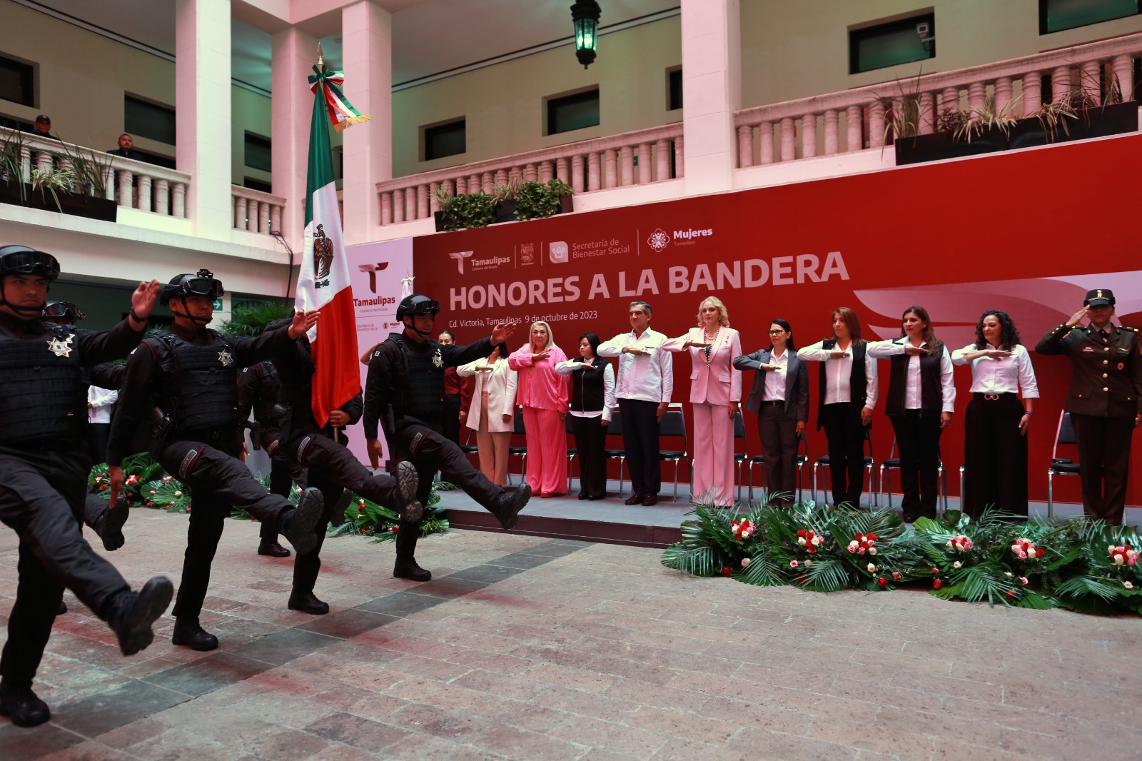 Tras citar a mujeres que se destacaron por diversas aportaciones como Gertrudis Bocanegra, Estefanía y Teodosia Castañeda, así como a Rita Cetina, el mandatario estatal también se refirió a la inclusión del escudo de Tamaulipas en el punto central del patio, colocado como parte de un proceso de restauración del edificio, símbolo del patrimonio de las y los tamaulipecos.