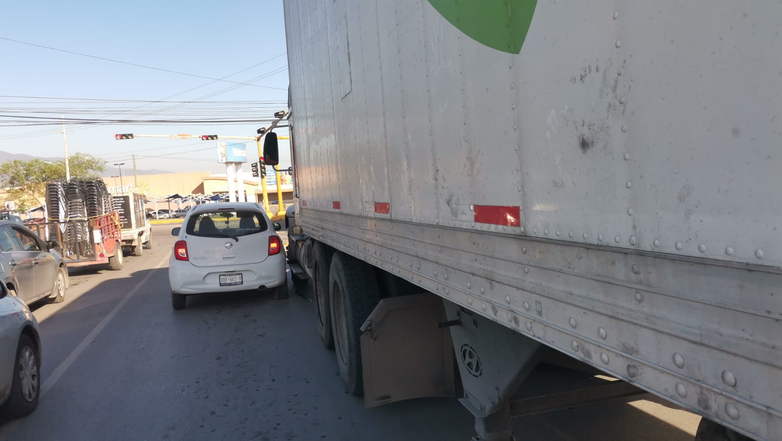 CD. VICTORIA, TAMAULIPAS, 28 DE OCTUBRE DE 2023.- Cuando intentaba dar vuelta a la derecha para incorporarse a la Prolongación de José Sulaimán Chagnón, un trailero ocasionó un percance vehicular al darle “un llegue” a un automóvil compacto.