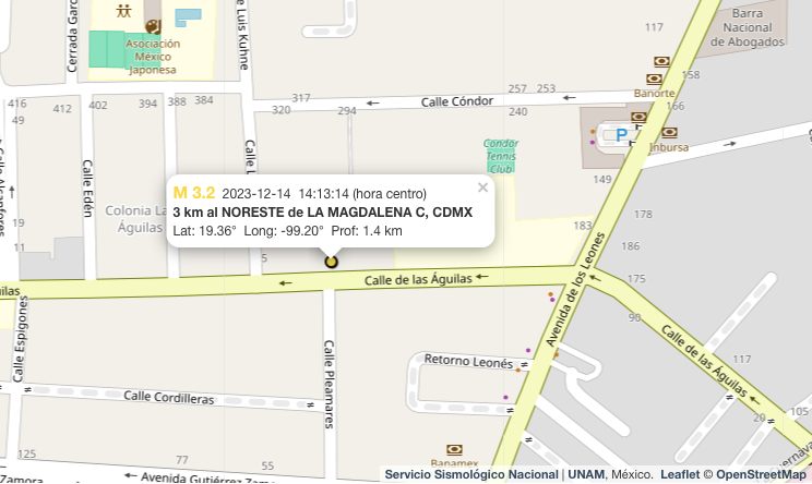El Servicio Sismológico Nacional informó que el epicentro se ubicó a 3 kilómetros al noreste de Magadalena Contreras y la magnitud fue de 3.2.