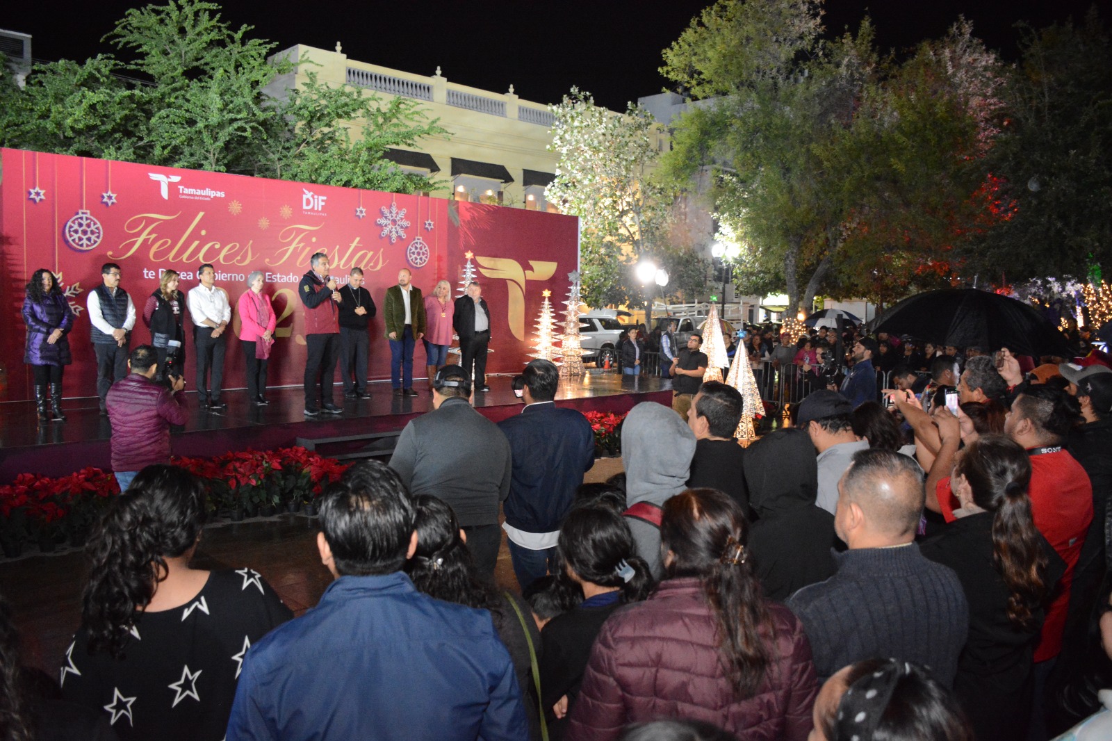 Ciudad Victoria, Tamaulipas.– El gobernador Américo Villarreal Anaya y la presidenta del DIF Tamaulipas, doctora María de Villarreal, presidieron este domingo el encendido del pino navideño y de la primera vela de adviento, en una emotiva fiesta que marca el inicio de las celebraciones navideñas y de fin de año en nuestro estado.