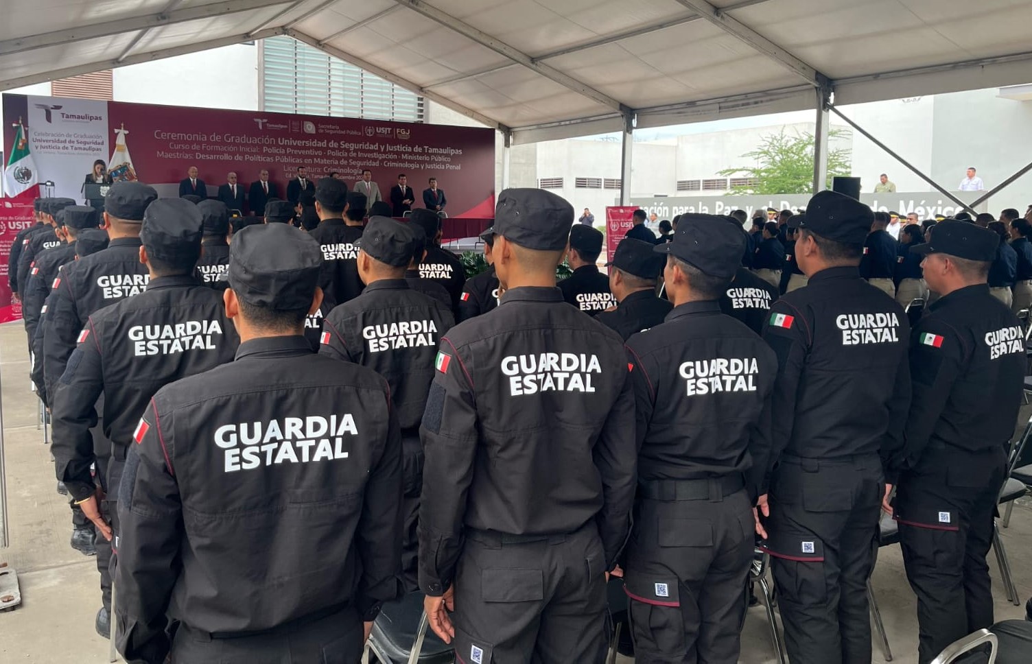 Ante la presencia del fiscal general de Justicia (FGJT), Irving Barrios Mojica y del rector de la Universidad de Seguridad y Justicia, Willy Zúñiga Castillo, así como de familiares de los graduados y personal en general, Chávez García felicitó a los nuevos guardias estatales, policías investigadores, ministerios públicos, licenciados y maestros quienes culminan esta nueva etapa.