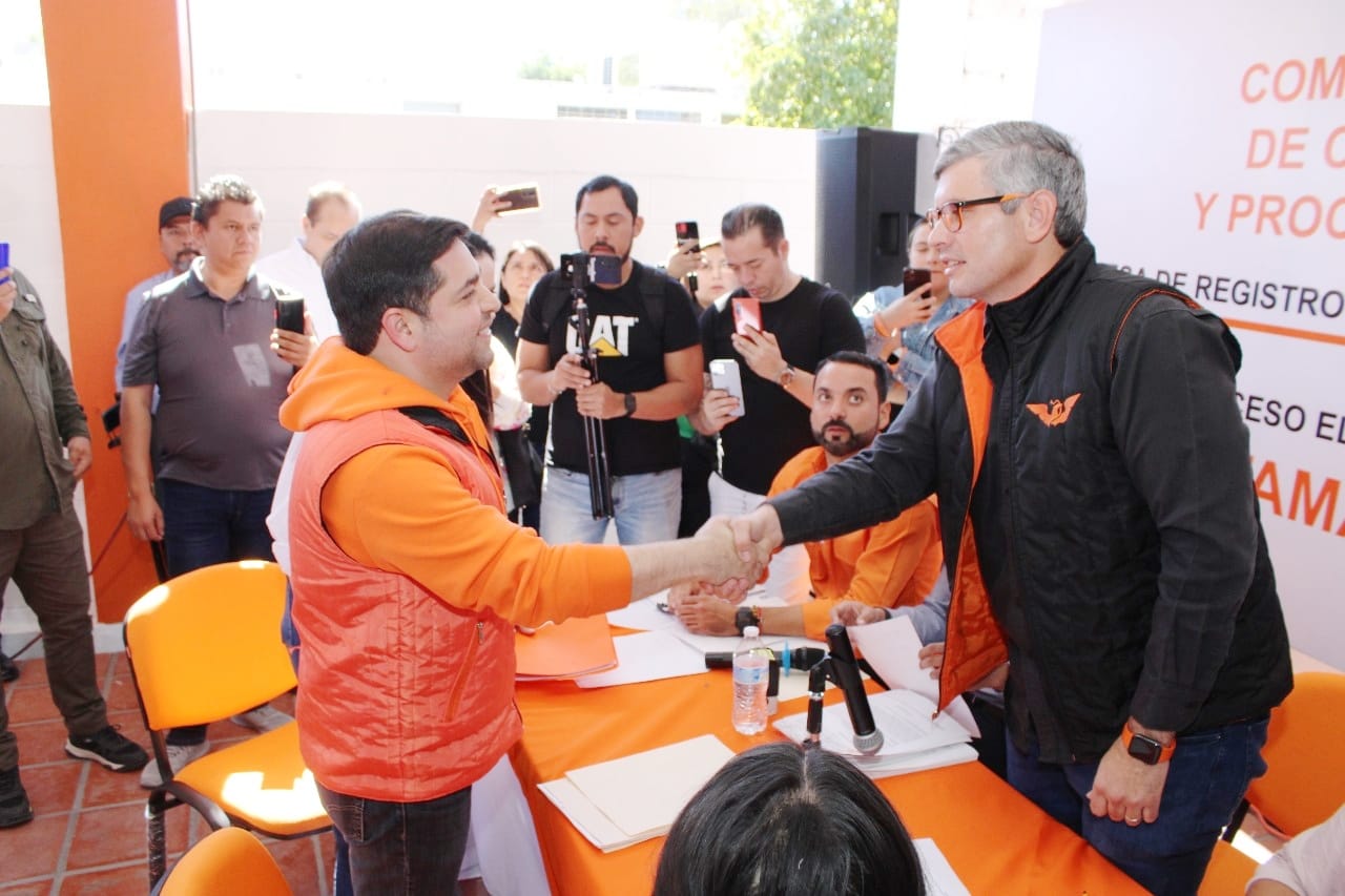 Los virtuales precandidatos llegaron acompañados por decenas de simpatizantes a las oficinas del Comité Directivo Estatal, en donde representantes de la Comisión Nacional de Convenciones y Procesos Internos les recibió la documentación.