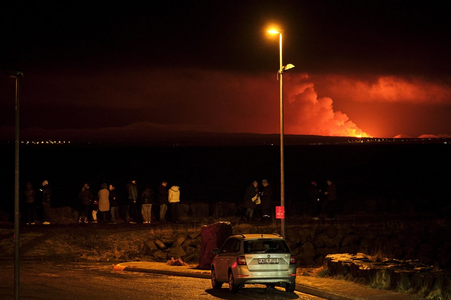 Reykjavik (Iceland), 18/12/2023.- Onlookers gather by the shoreline in Reykjavik to watch the volcanic eruption that started near the town of Grindavik on the Reykjanes peninsula, Iceland, 19 December 2023. The start of a volcanic eruption was announced by Iceland's Meteorological Office on 18 December night after weeks of intense earthquake activity in the area. (Terremoto/sismo, erupción volcánica, Islandia) EFE/EPA/ANTON BRINK