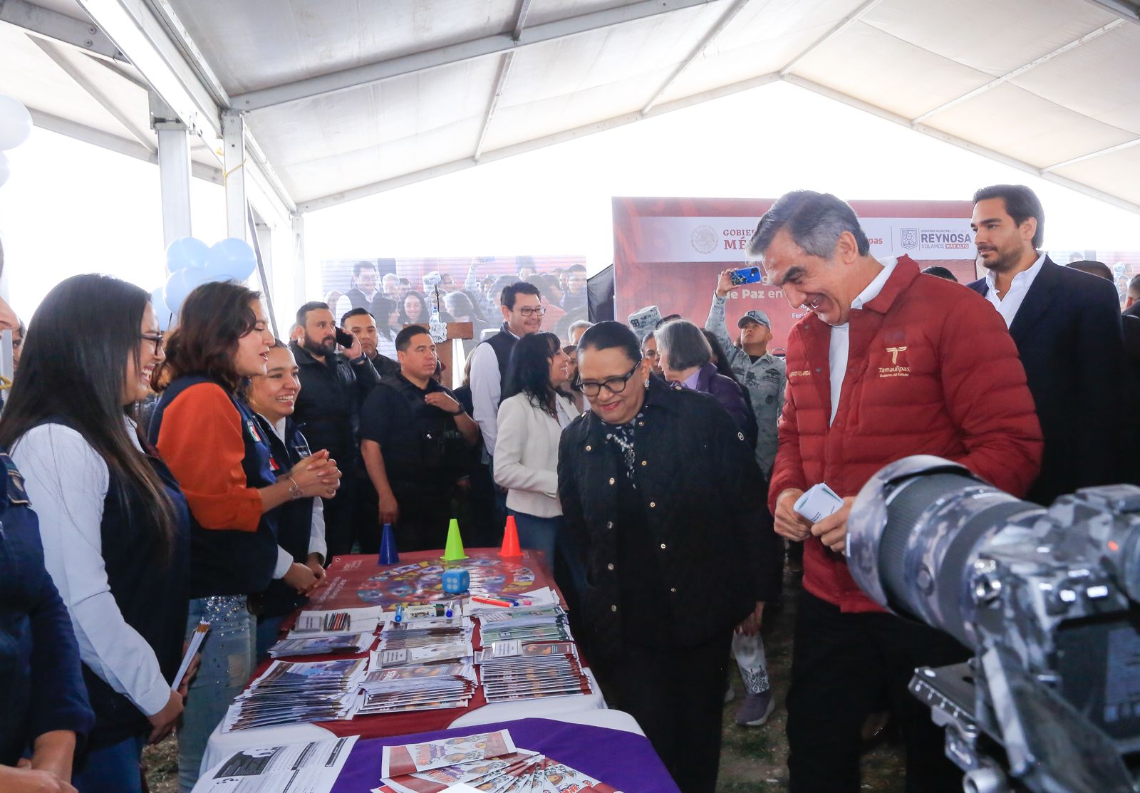 Asistieron al evento Carlos Peña Ortiz, alcalde de Reynosa; Beatriz López López, titular de la Unidad de Políticas y Estrategias para la Construcción de Paz con Entidades Federativas y Regiones de la Secretaría de Seguridad y Protección Ciudadana; Héctor Joel Villegas González, secretario general de Gobierno; Sergio Chávez García, secretario de Seguridad Pública y Luis Lauro Reyes Rodríguez, delegado de Programas Federales para el Bienestar, funcionarios del gabinete estatal y representantes de las fuerzas federales de seguridad.