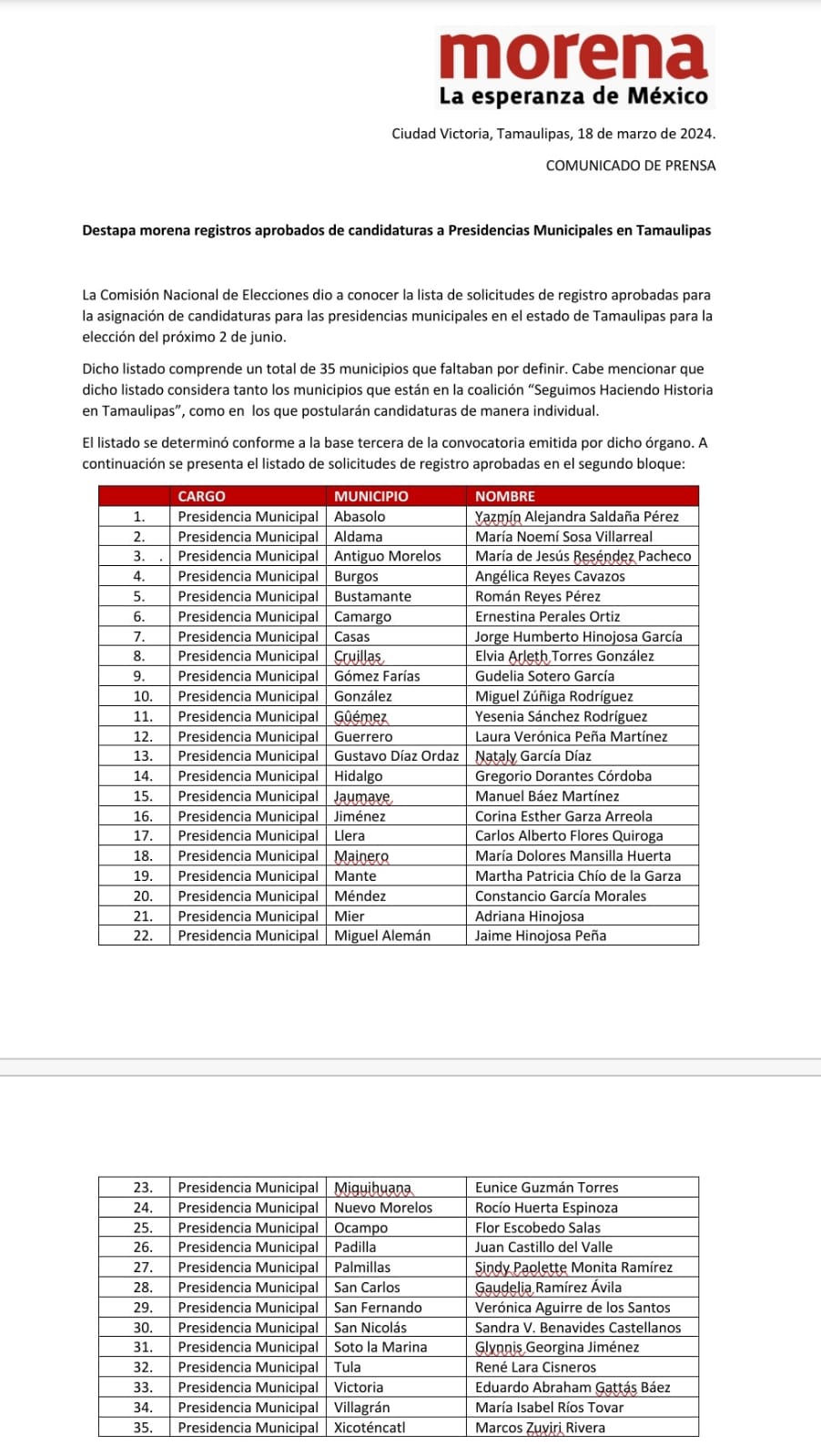Dicho listado comprende un total de 35 municipios que faltaban por definir. Cabe mencionar que dicho listado considera tanto los municipios que están en la coalición “Seguimos Haciendo Historia en Tamaulipas”, como en los que postularán candidaturas de manera individual.
