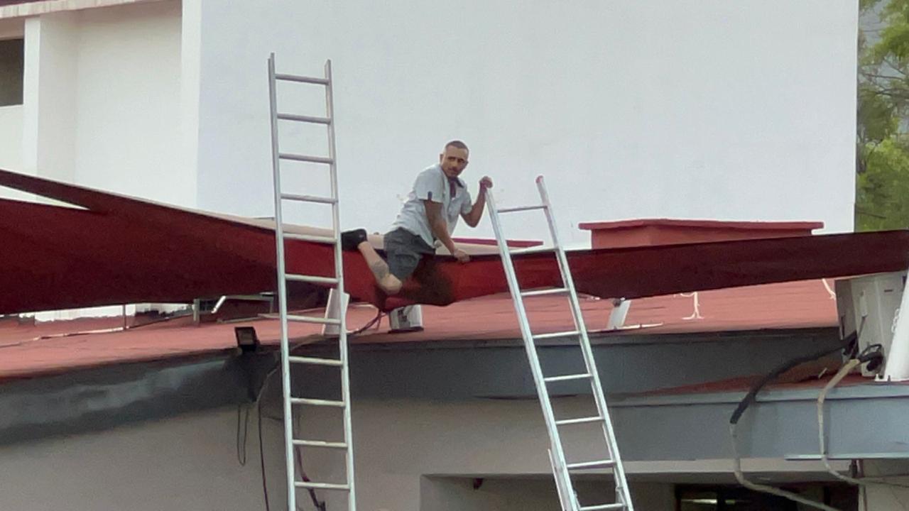 Aún con una escalera por cada lado ya cuando se colocó sobre una malla sombra abandonando el techo de concreto haciendo más vulnerable su situación, dicha persona se negó a desistir y dialogar.