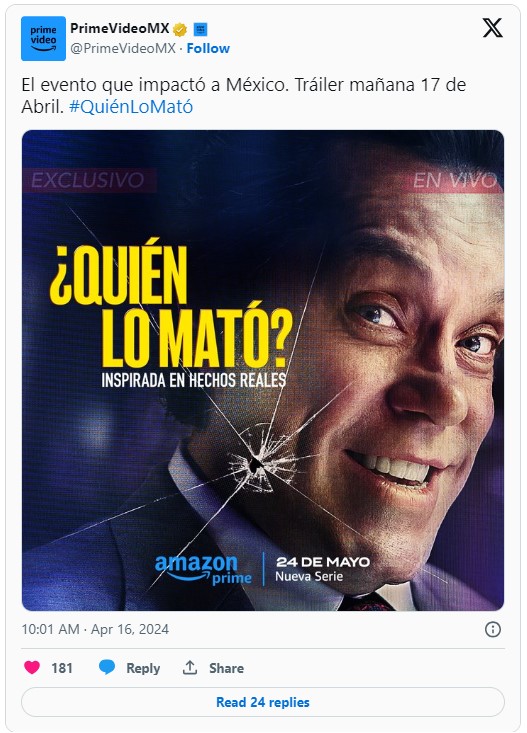 Prime Video, la plataforma de streaming encargada de transmitir la serie, anunció a través de sus redes sociales que “¿Quién lo mató?” estará disponible para el público a partir del 24 de mayo. Además, revelaron el primer póster oficial de la serie, donde vemos a Roberto Duarte caracterizado como Paco Stanley. Para aumentar la anticipación, se anunció que mañana, 17 de abril, se lanzará el tráiler oficial, brindando a los espectadores un vistazo más profundo a la trama.