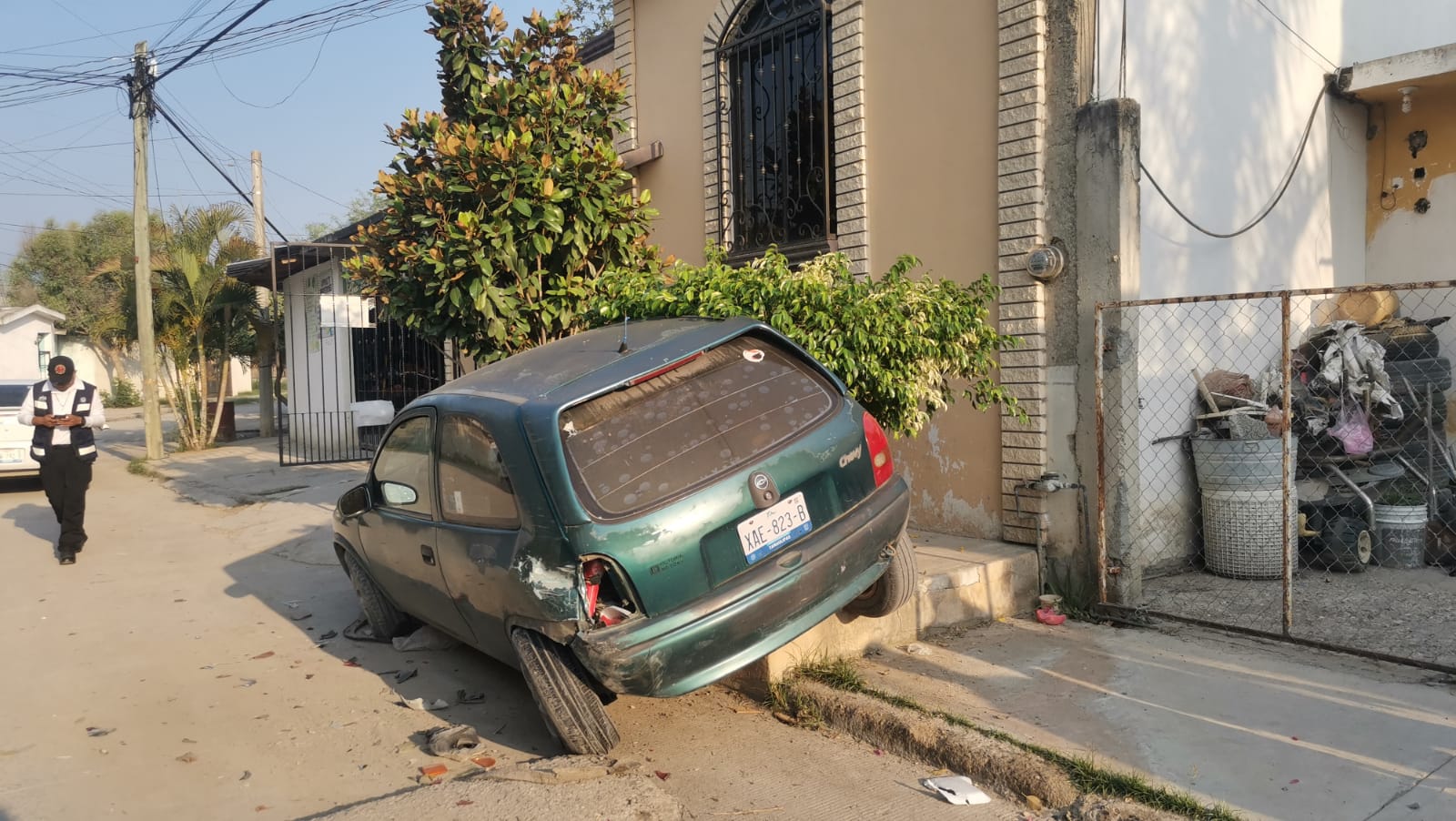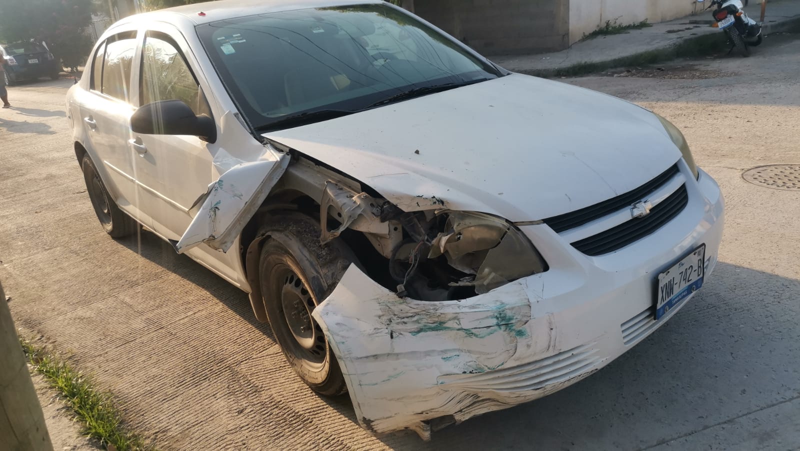 Al ser impactado, el automóvil Chevy salió proyectado y quedó parcialmente trepado en la banqueta.