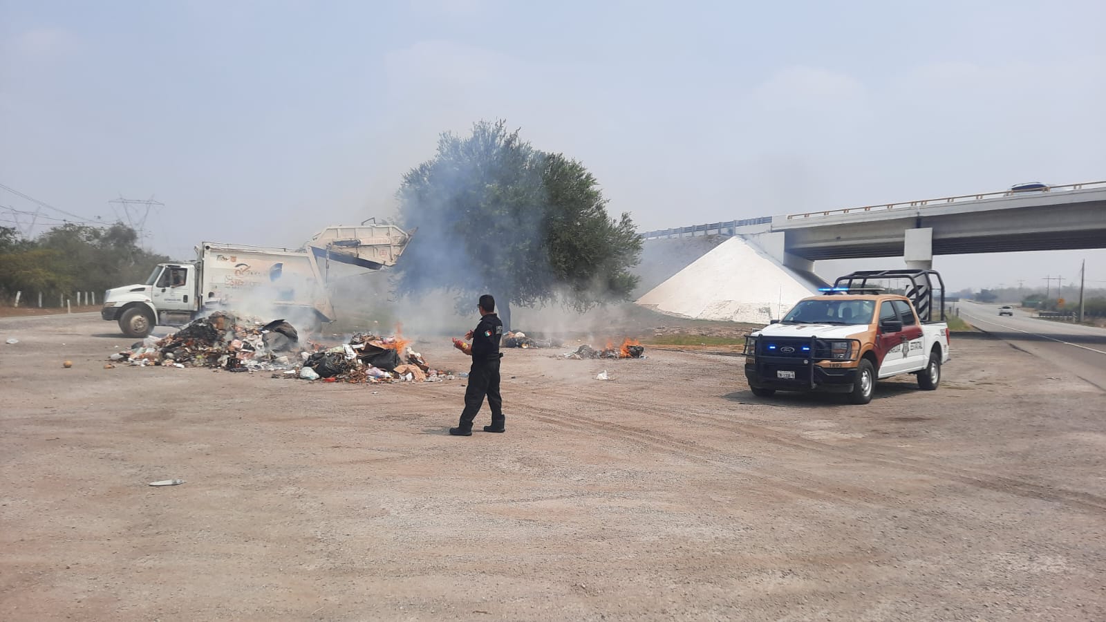 Al realizar recorridos de seguridad y vigilancia sobre el kilómetro 03 de la Carretera Federal número 08, personal de la Guardia Estatal de Apoyo Carretero comisionado a la Estación Segura Villa Manuel auxilió al conductor de un camión recolector de basura tras el incendio de la unidad.