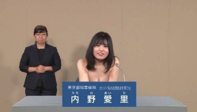 En medio de una extraña competencia a la gubernatura de Tokio, donde uno de los aspirantes se disfrazó como el supervillano Joker, la candidata e influencer Uchino Airi se quitó la blusa en pleno debate.