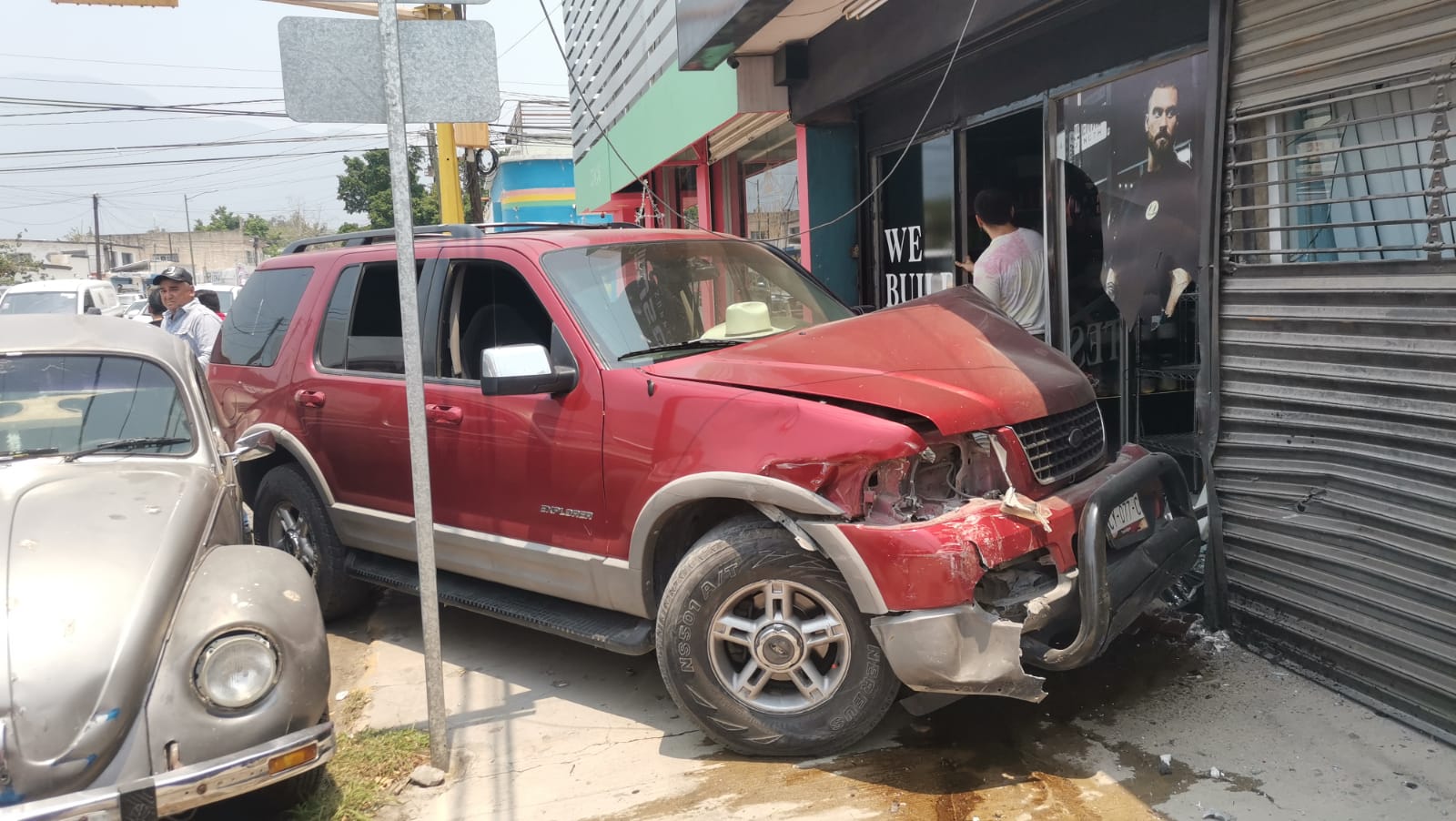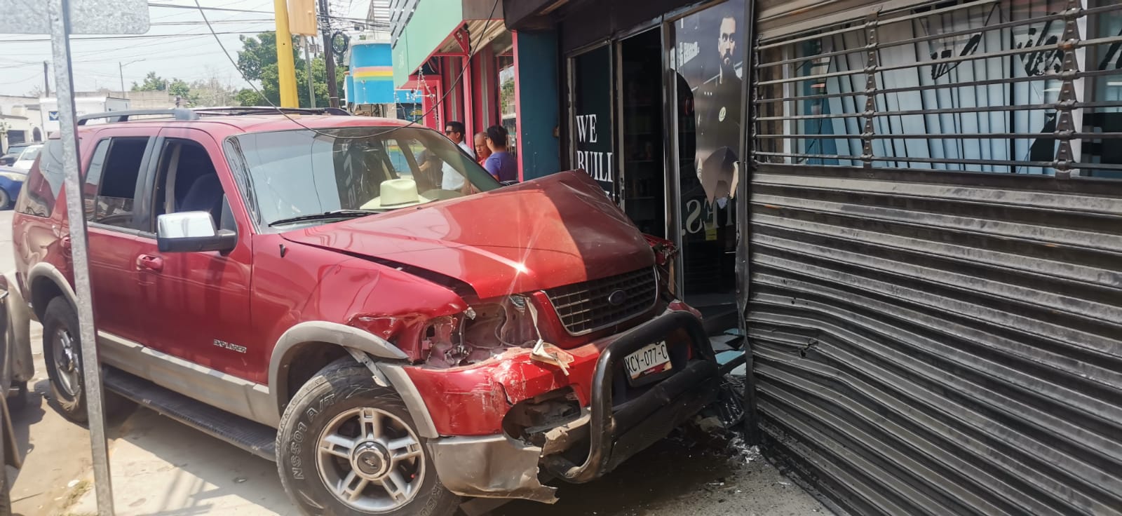 Posteriormente la camioneta Explorer se trepó a la banqueta y terminó su trayectoria sin control impactándose contra dos establecimientos comerciales causando cuantiosos daños materiales.