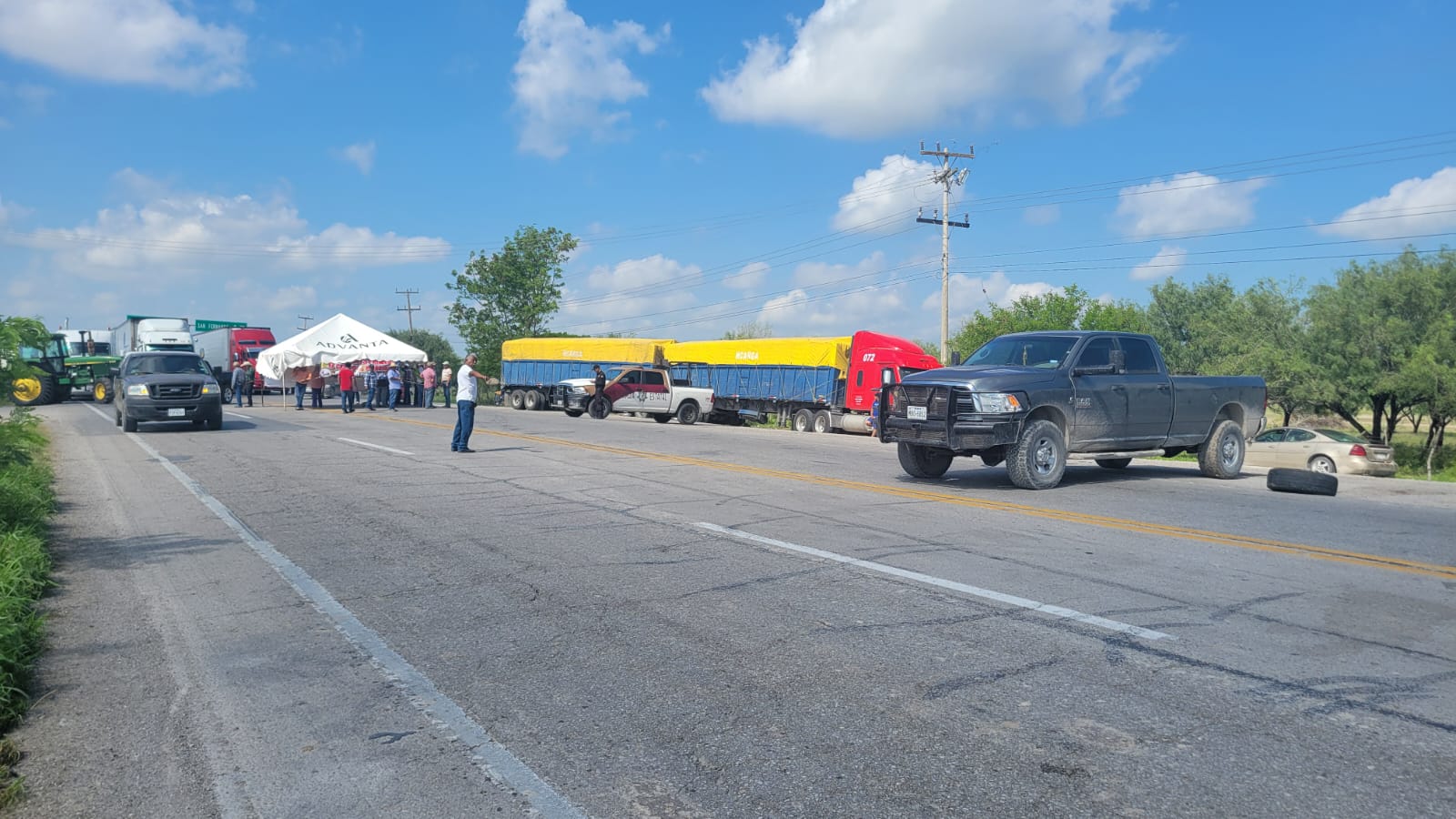 San Fernando, Tamaulipas (28 de junio de 2024).- Productores de sorgo se encuentran bloqueando parcialmente la circulación vial en la Carretera Federal 101 a la altura del municipio de San Fernando.