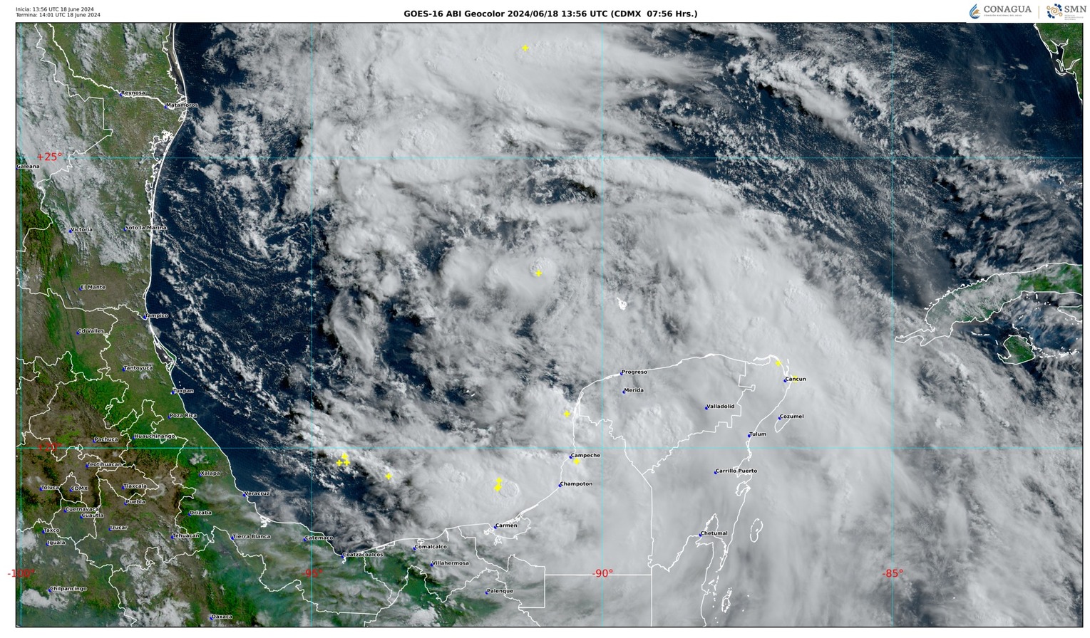 Hoy, el Potencial Ciclón Tropical Uno, inestabilidad en niveles altos de la atmósfera, un canal de baja presión sobre norte, occidente, centro y sur de México y una línea seca en el norte del país, ocasionarán lluvias intensas (de 75 a 150 milímetros [mm]) en Campeche, Chiapas, Oaxaca, Puebla, Quintana Roo, Tamaulipas, Veracruz y Yucatán; muy fuertes (50 a 75 mm) en Hidalgo, San Luis Potosí y Tabasco; fuertes (de 25 a 50 mm) en Guerrero, Nuevo León y Querétaro; chubascos (de 5 a 25 mm) en Coahuila, Colima, Durango, Estado de México, Jalisco, Michoacán, Morelos, Nayarit, Sinaloa y Tlaxcala, y lluvias aisladas (de 0.1 a 5 mm) en la Ciudad de México y Guanajuato.