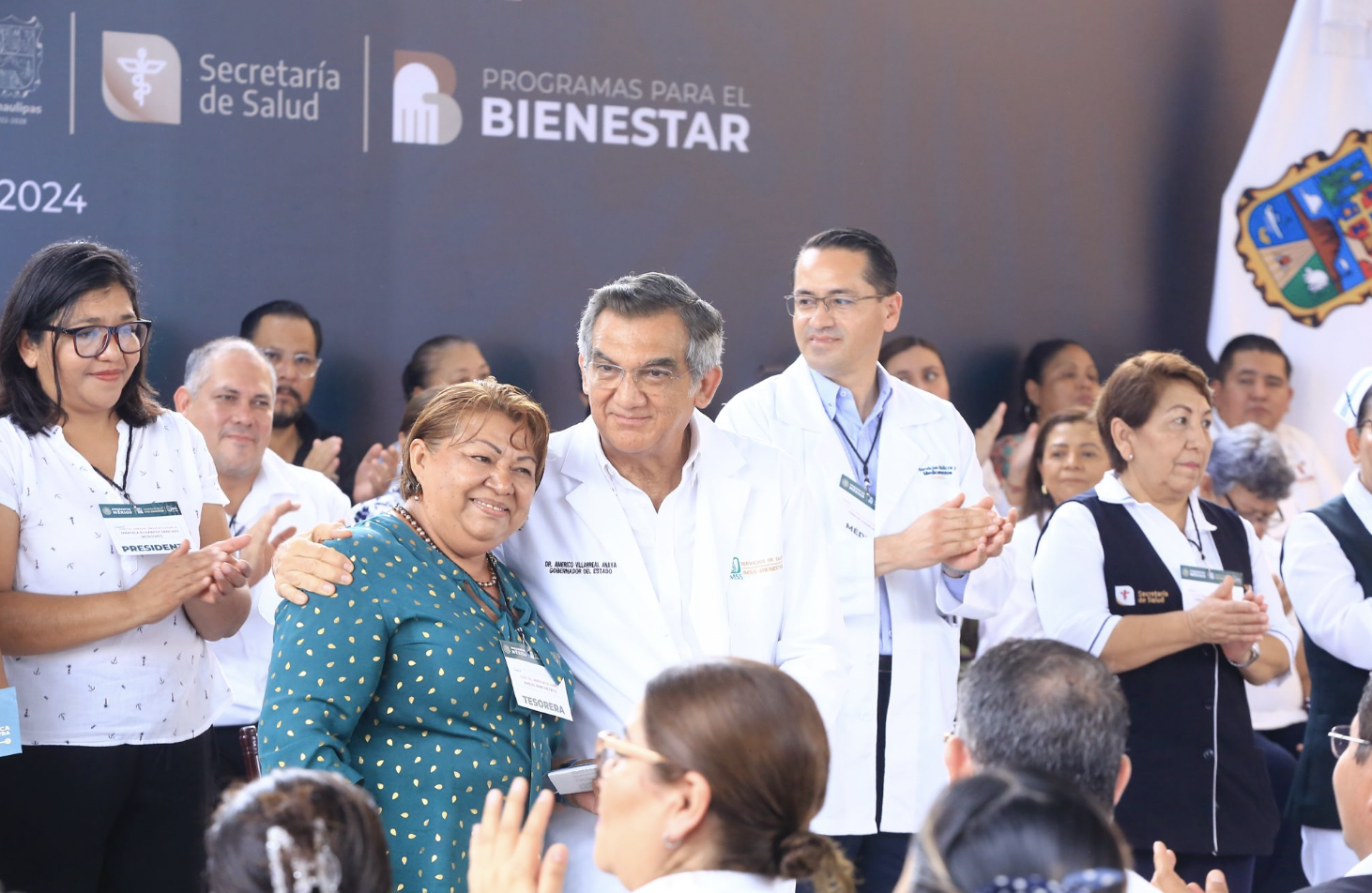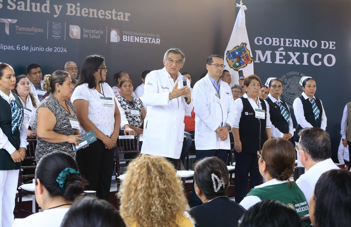 Ciudad Victoria, Tamaulipas (6 de junio de 2024).- “En Tamaulipas tenemos la bata bien puesta, todos sumados y comprometidos con el presidente Andrés Manuel López Obrador y con el nuevo modelo de atención a la salud IMSS-Bienestar, para garantizar el servicio médico en forma gratuita a la población sin seguridad social, considerando esto como un derecho humano”, expresó el gobernador Américo Villarreal Anaya.
