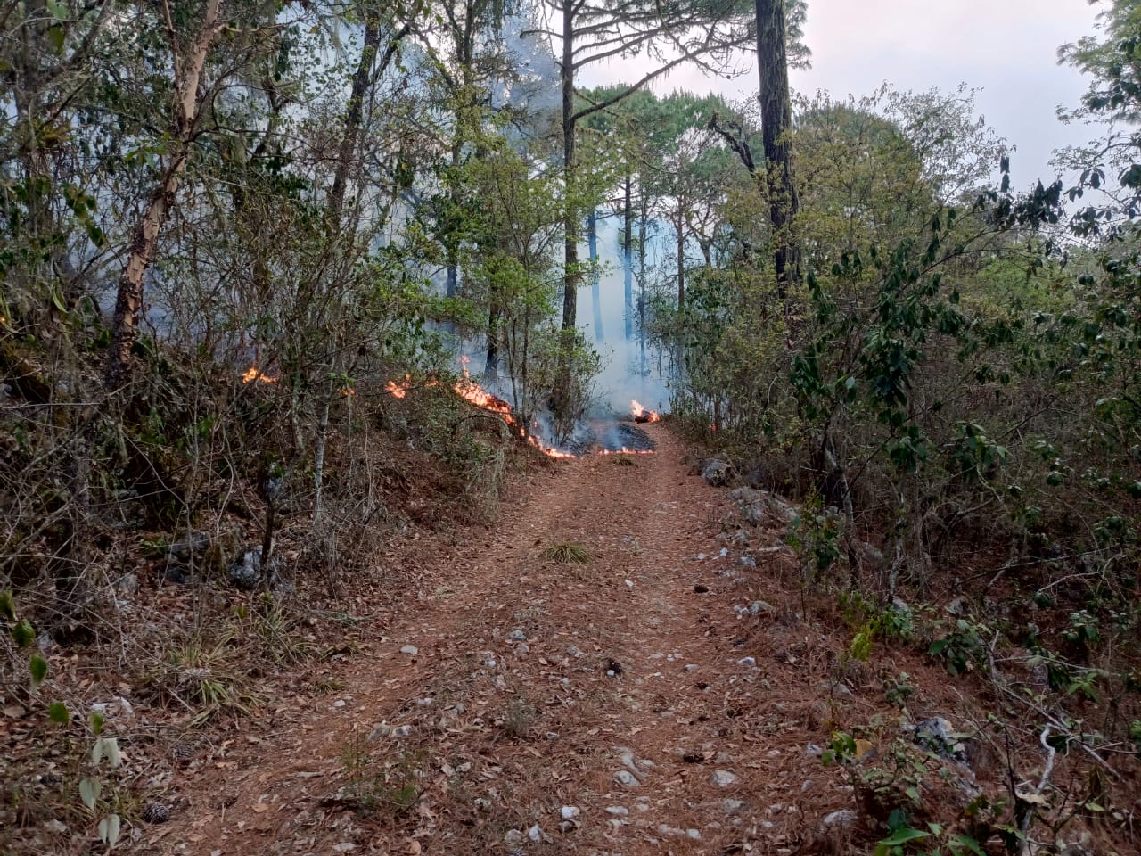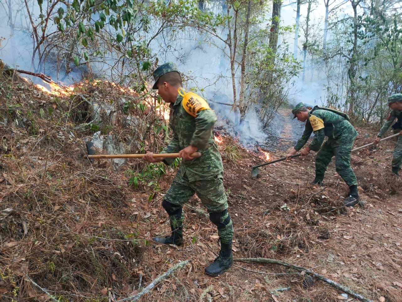 Hasta la fecha se han afectado 60 hectáreas de hojarasca de encino, barba de pino y matorral bajo, por lo que se encuentran participando en estas actividades 35 efectivos y 2 vehículos del Ejército Mexicano; 20 agentes y tres vehículos de la Guardia Nacional; así como seis elementos de protección civil y 34 voluntarios del citado municipio, con el empleo de diverso equipo y material especializado para el combate de este tipo de incendios, logrando hasta el momento el 35 por ciento del control y 25 por ciento de sofocación de dicho incendio.