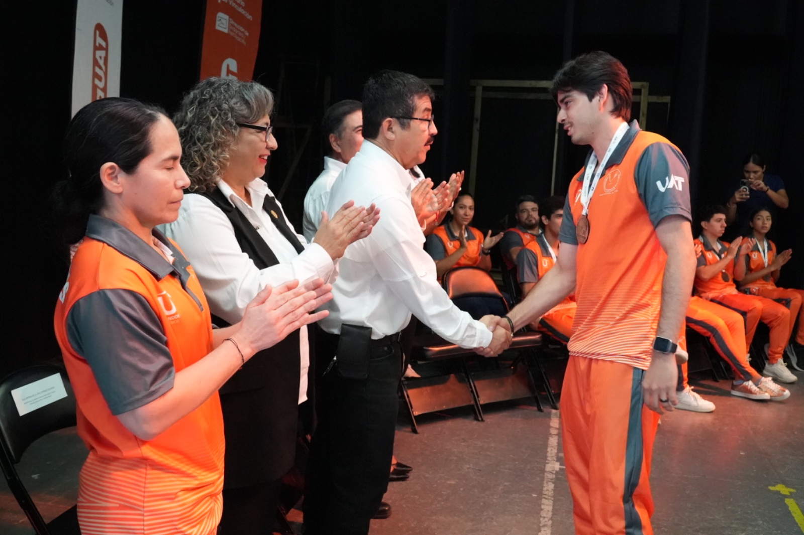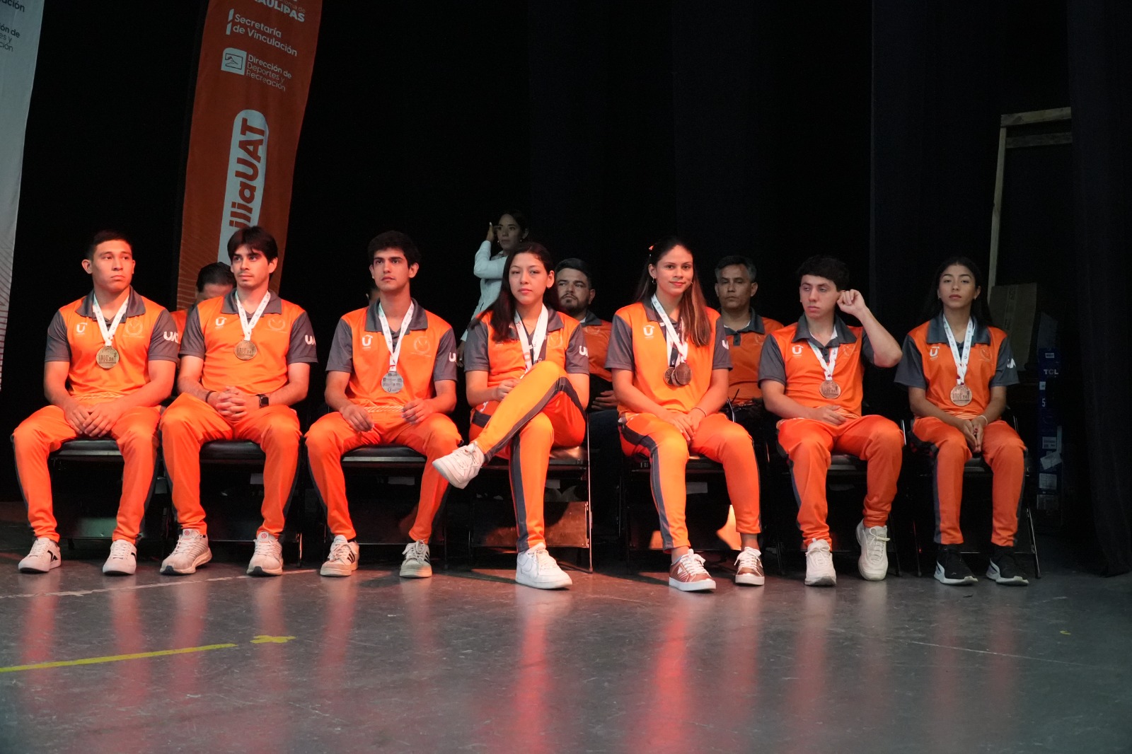 En este encuentro, la UAT hizo patente el reconocimiento a sus medallistas José Alfredo Quintá López, Brandon Alan Romo Beltrán, Alejandra Yamile Badillo Varela, Patricia Joseline Estrada Tirado, José Ignacio Pérez Ortiz, Natalia Montserrat Sarmiento Rodríguez, Sandor Ulices Grimany García y Laura Melisa Zamora España.