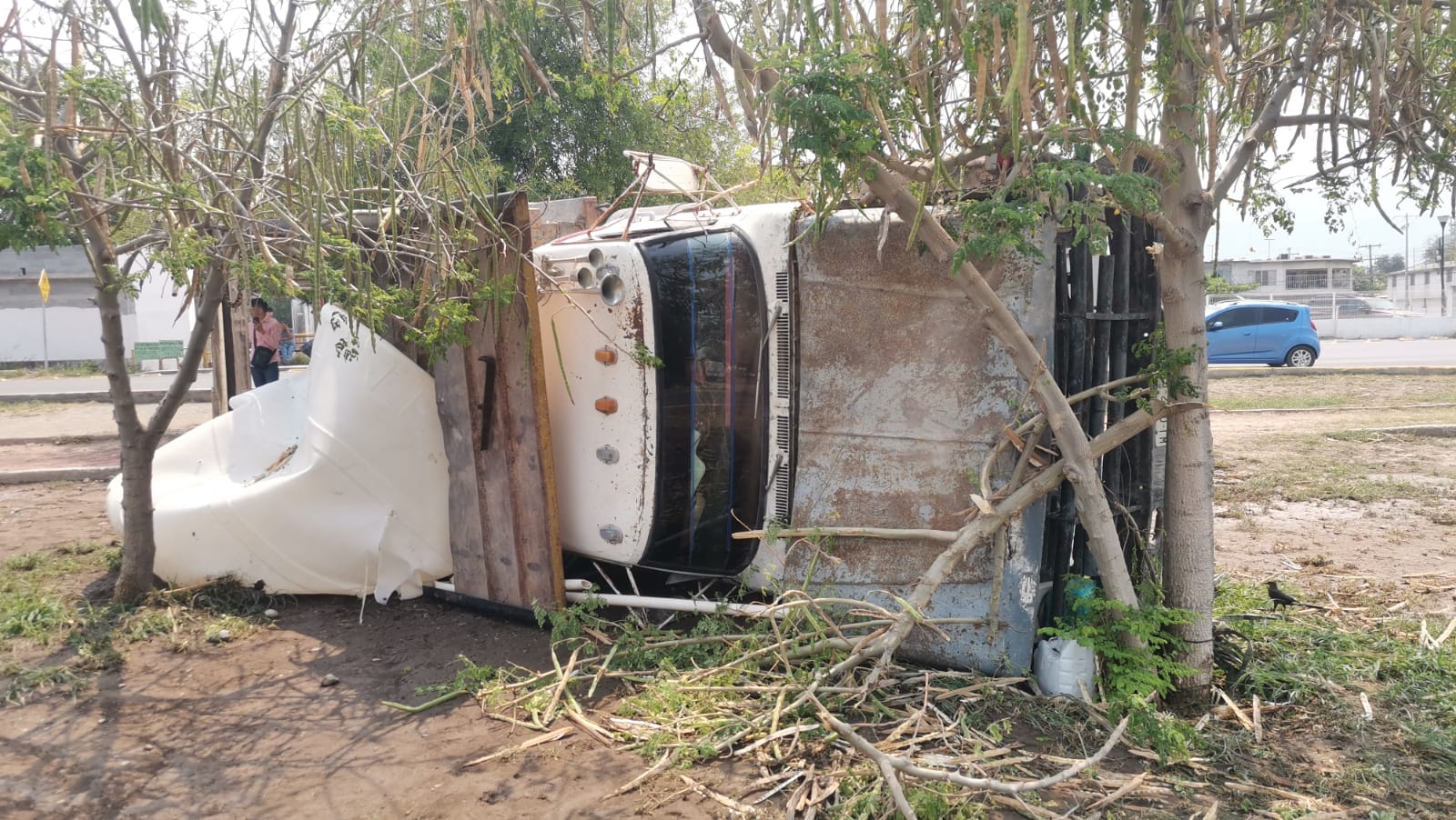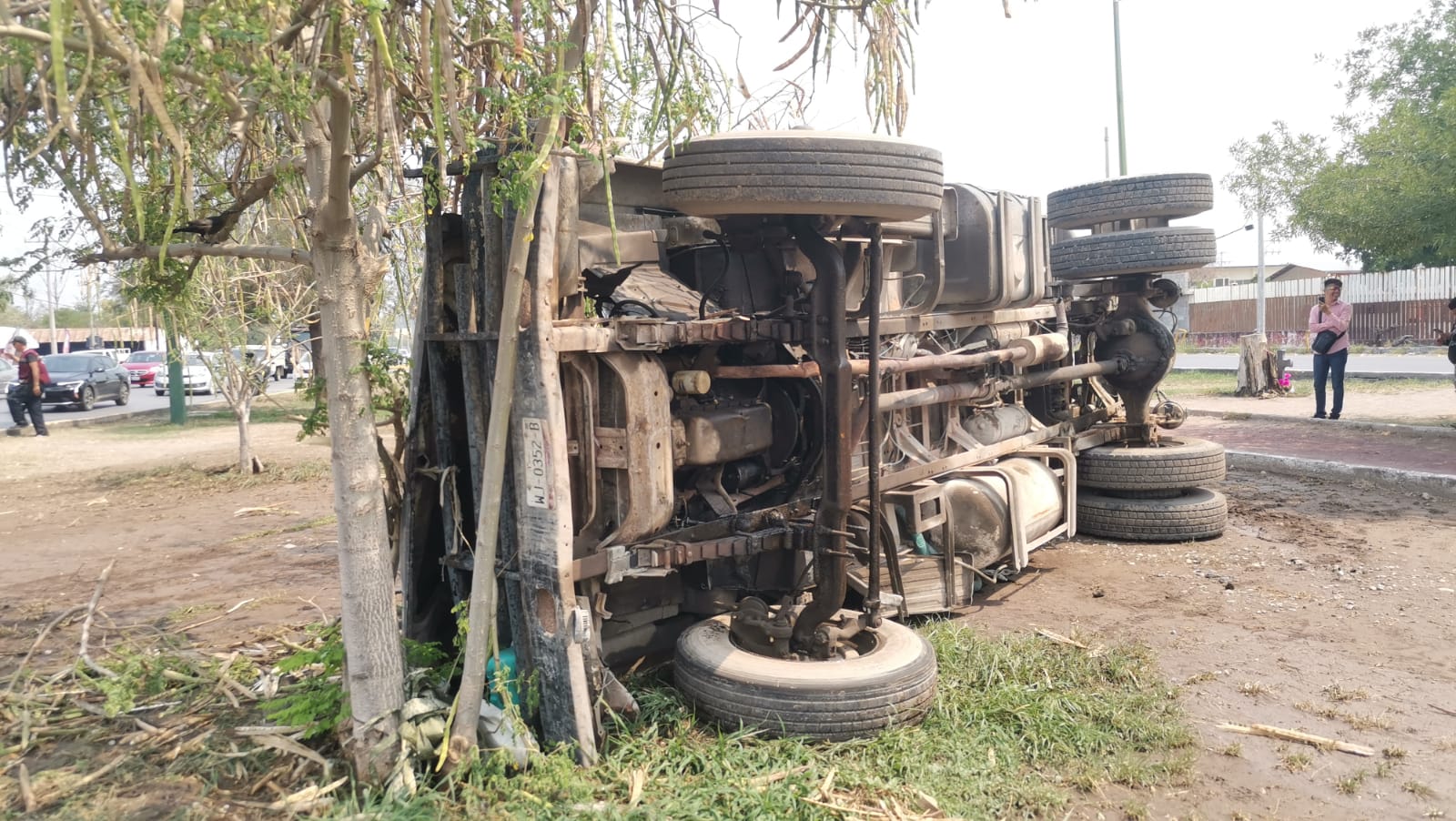 Después de avanzar varios metros por el camellón, el camión de volteo chocó contra un pequeño árbol y terminó por volcar sobre uno de sus costados.