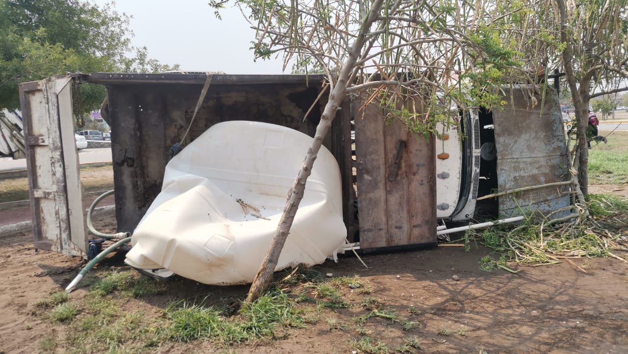 A consecuencia del accidente los miles de litros de agua que transportaba el camión de volteo en un contenedor se tiraron en el lugar.
