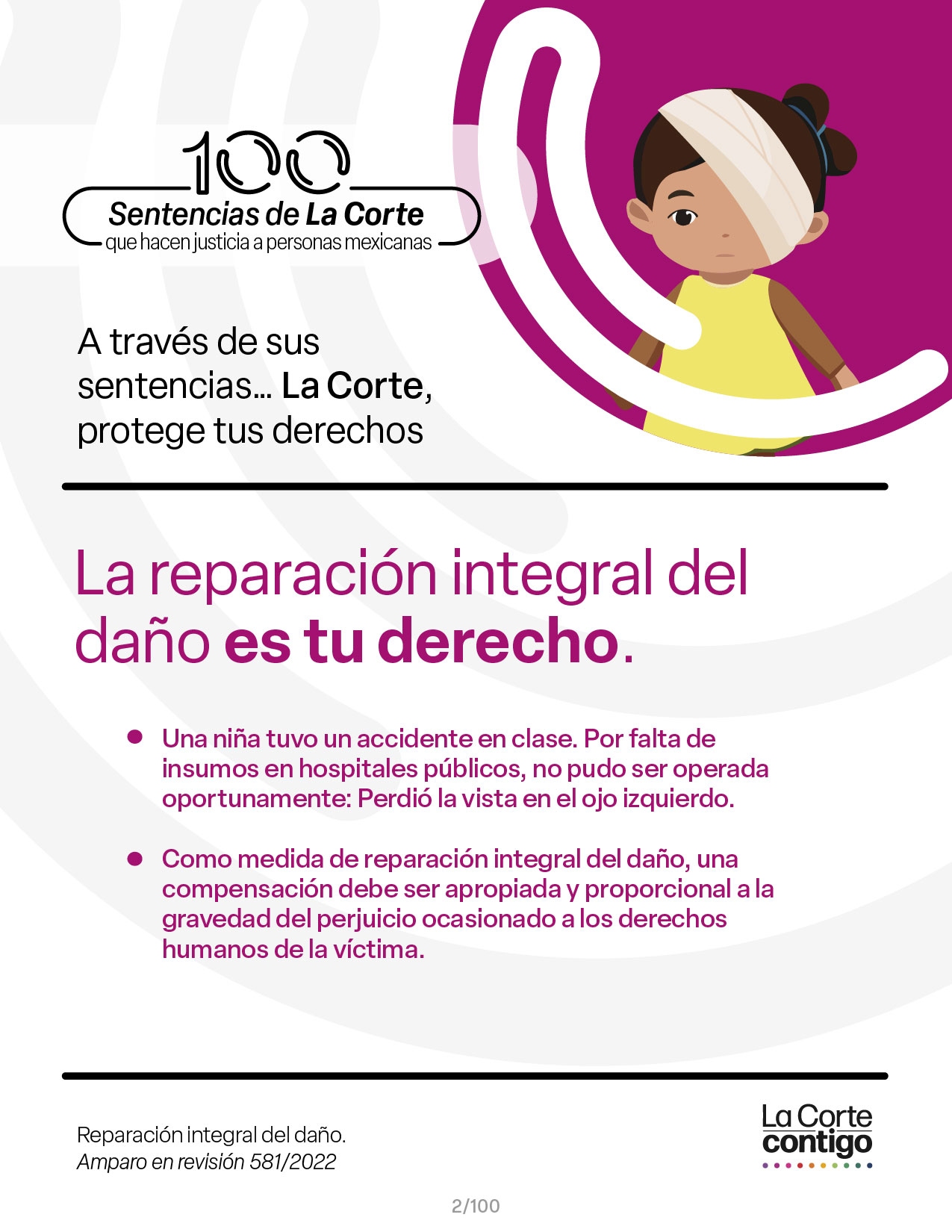 Ciudad Victoria, Tamaulipas (2 de julio de 2024).- En medio de los foros organizados para analizar la reforma al Poder Judicial, la Suprema Corte de Justicia de la Nación (SCJN) inició una campaña llamada #100Sentencias en donde difunde casos en los que se defienden los derechos humanos, uno de ellos es el de una niña de Ciudad Victoria que perdió la vista en uno de sus ojos a raíz de un incidente escolar.