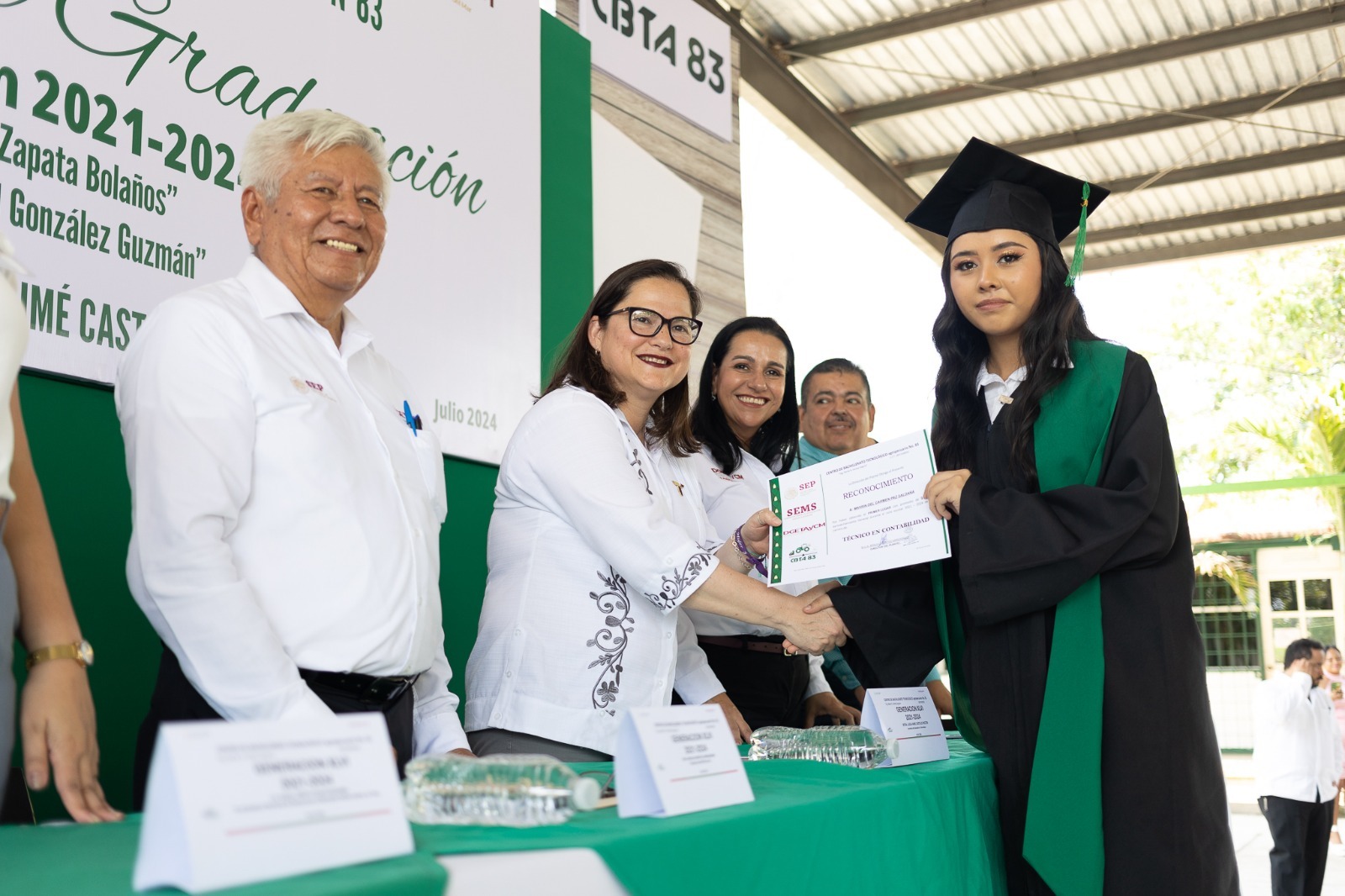 En la ceremonia también estuvieron presentes el director del CBTA No. 83, Braulio Benítez Arredondo; el enlace de la Dirección General de Educación Tecnológica Agropecuaria y Ciencias del Mar (DGETAyCM) en Tamaulipas, María Guadalupe Samantha Montiel Orduño, así como maestras, maestros y las familias de las y los estudiantes que egresaron