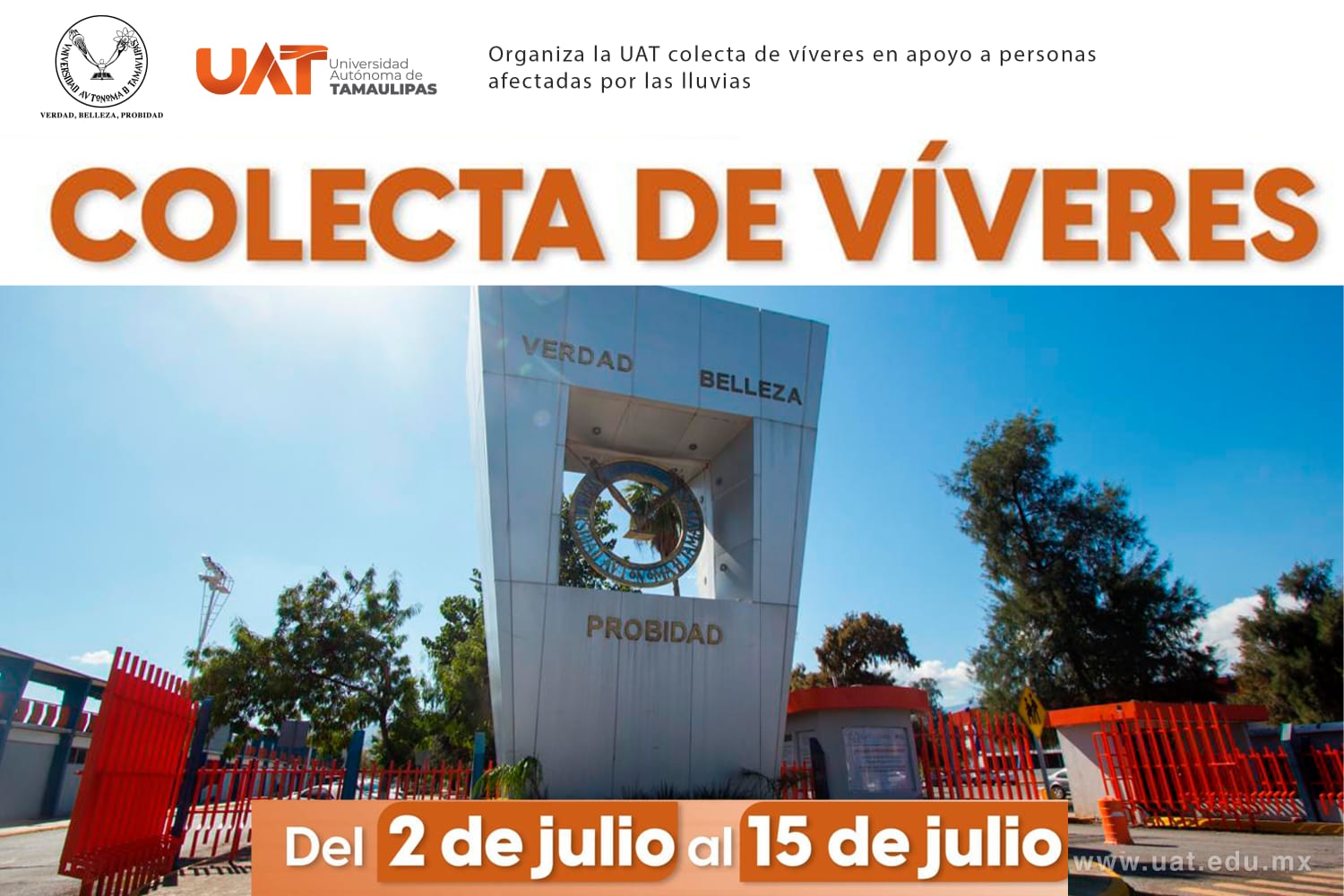 La Universidad Autónoma de Tamaulipas (UAT) convoca a su comunidad estudiantil, académica y administrativa a participar en la colecta de víveres destinada a apoyar a las personas afectadas por las recientes lluvias en la entidad.