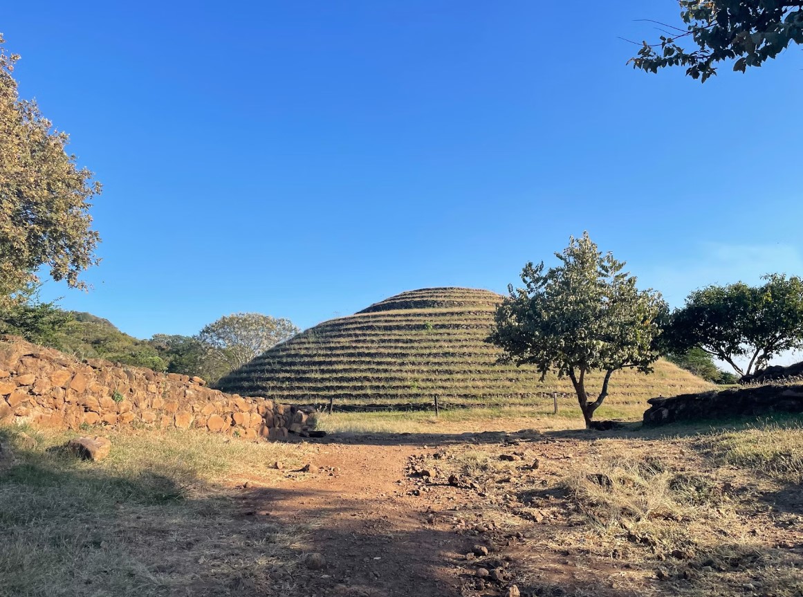 El sitio arqueológico Guachimontones es conocido por sus estructuras cónicas escalonadas y su patio circular, rodeado de edificios dispuestos en círculos concéntricos. En el corazón de este lugar se encuentran dos juegos de pelota, junto con terrazas, estructuras funerarias y otros edificios que reflejan la compleja organización de esta civilización.