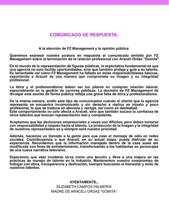 En respuesta, Elizabeth Campos, madre de Gomita, emitió un comunicado expresando su postura y criticando duramente a FZ Management. Campos resaltó que es responsabilidad de una agencia proteger y guiar a sus talentos, y acusó a la empresa de exponer a su hija de manera perjudicial. “Es lamentable ver cómo FZ Management ha fallado en estas responsabilidades básicas, exponiendo a Araceli de una manera que compromete su imagen y su integridad profesional,” afirmó Campos.