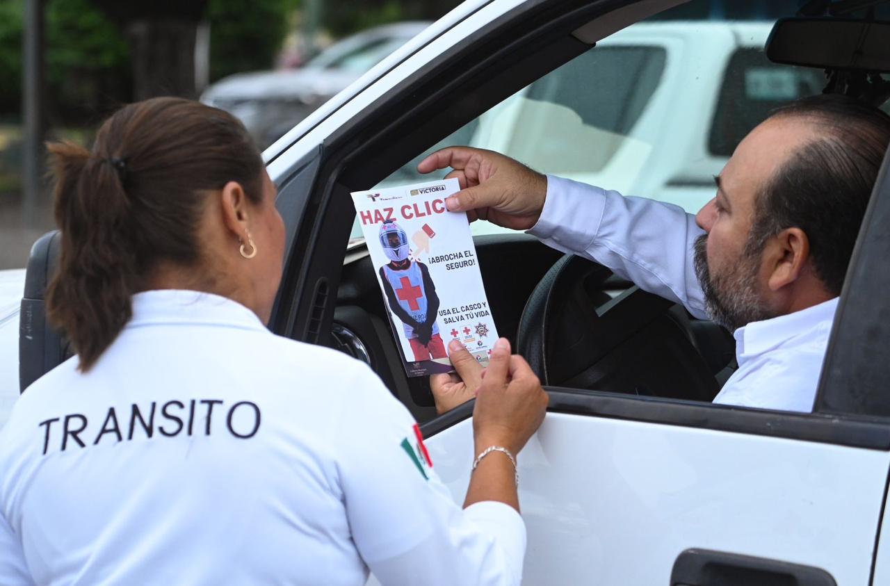 La delegada de la Cruz Roja Mexicana en Tamaulipas, Graciela Guerra de Araujo, participó junto a Livio Flores Rodríguez, director de tránsito, en la actividad que tiene como objetivo reducir el número de accidentes en la ciudad por conducción de motocicleta.